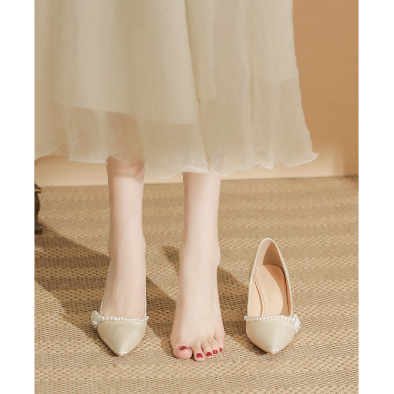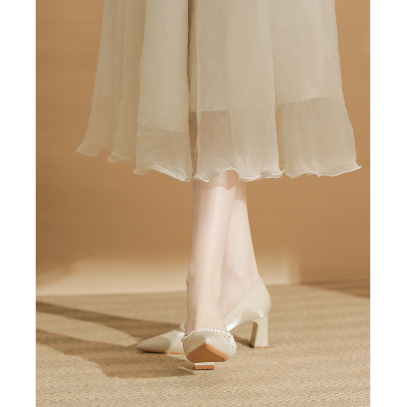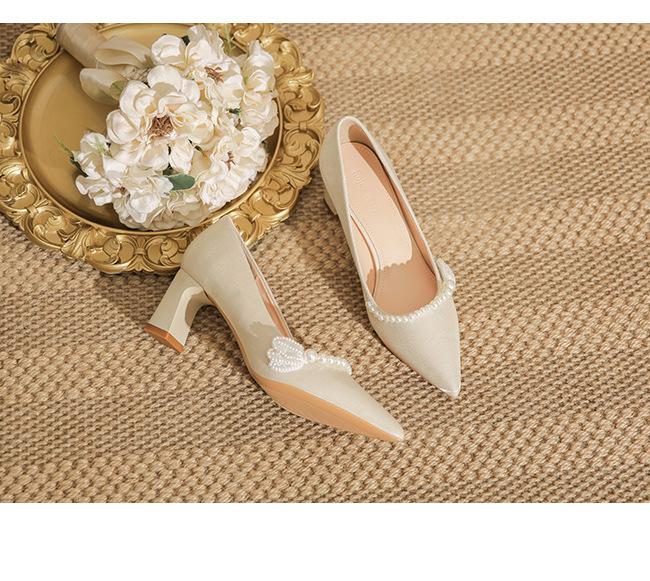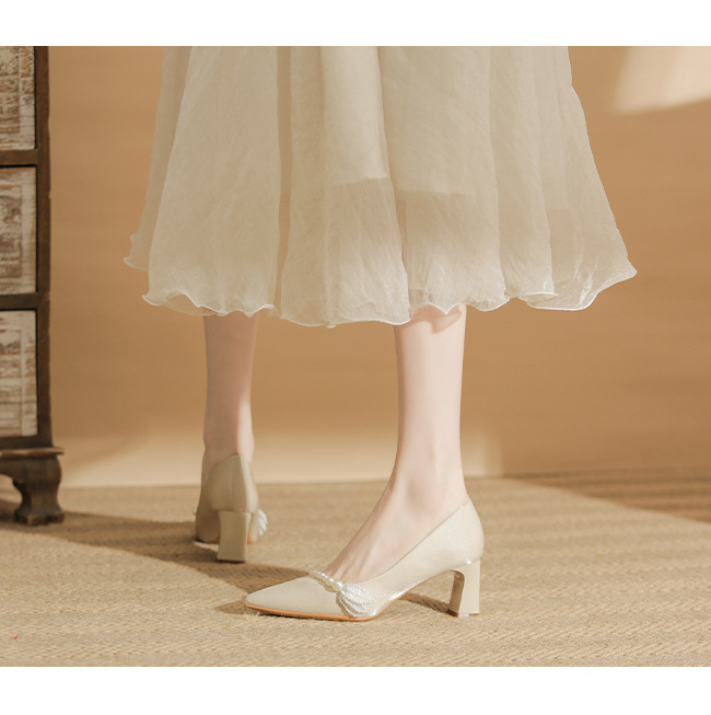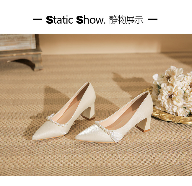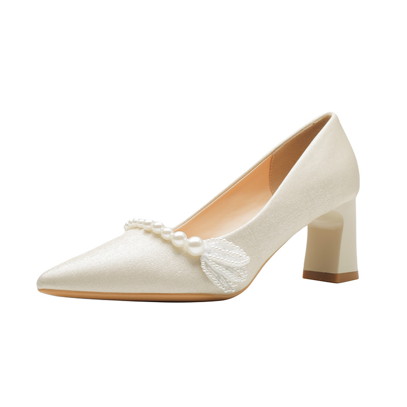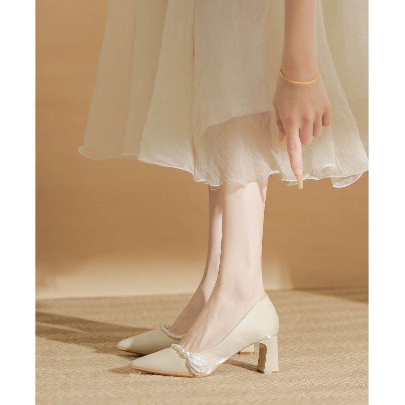 法式珍珠粗跟高跟鞋设计感小众气质缎面尖头礼服伴娘鞋浅色