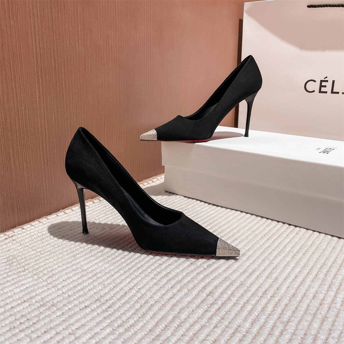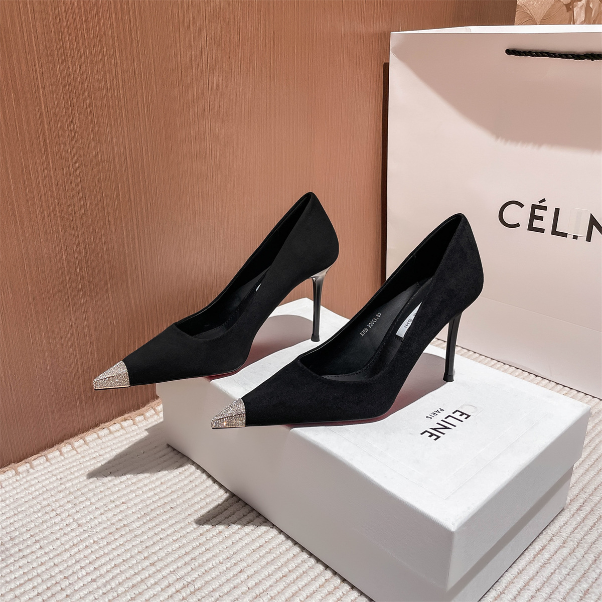 法式黑色绒面高跟鞋年春季新款金属头性感御姐气质单鞋女细跟