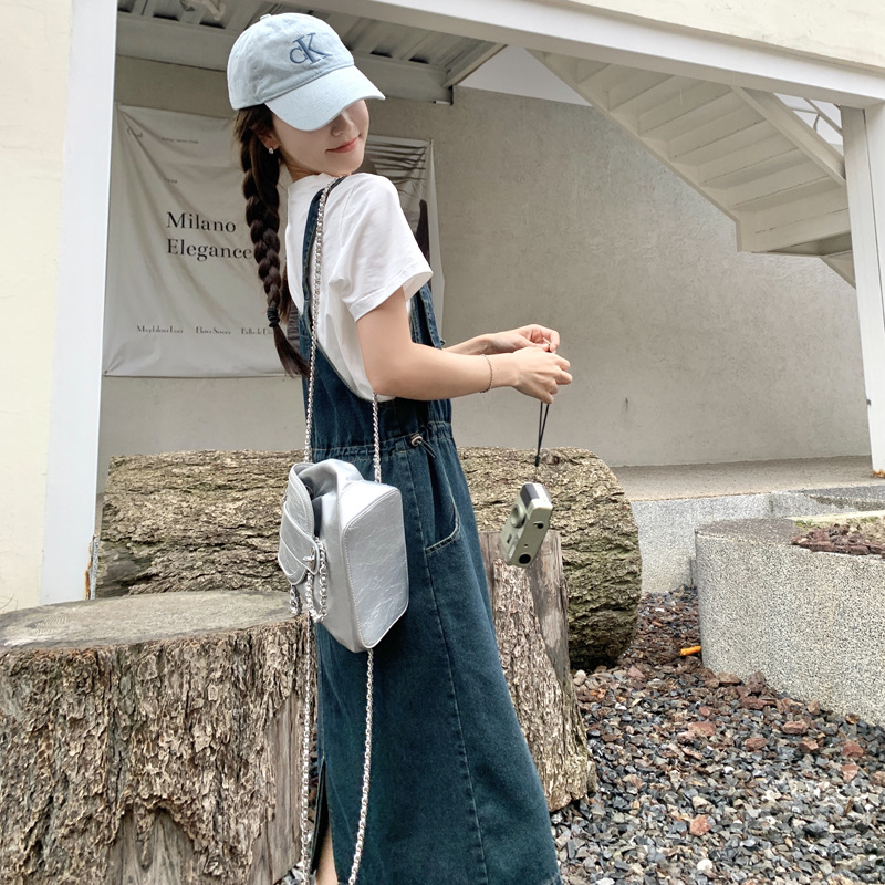 时尚韩版简约白色T恤调节纽扣抽绳牛仔背带裙两件套夏休闲套装女