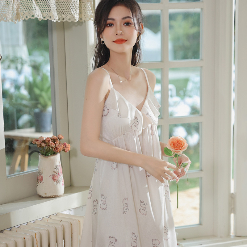 薄款吊带睡裙女夏季印花可爱中长款冰丝睡衣裙带胸垫可外穿家居服