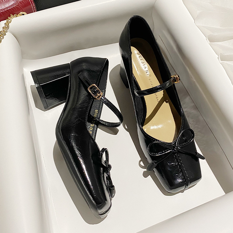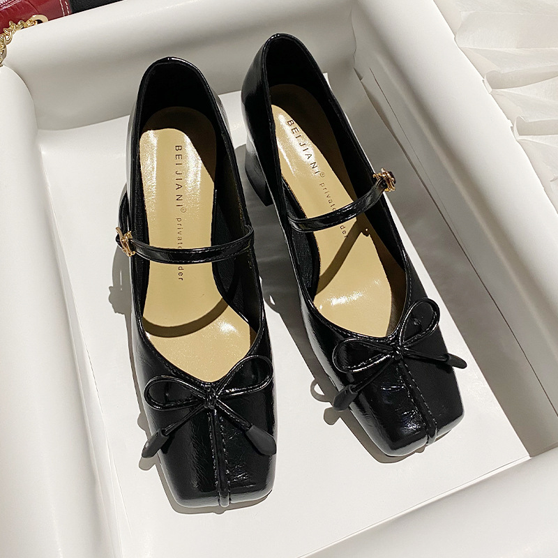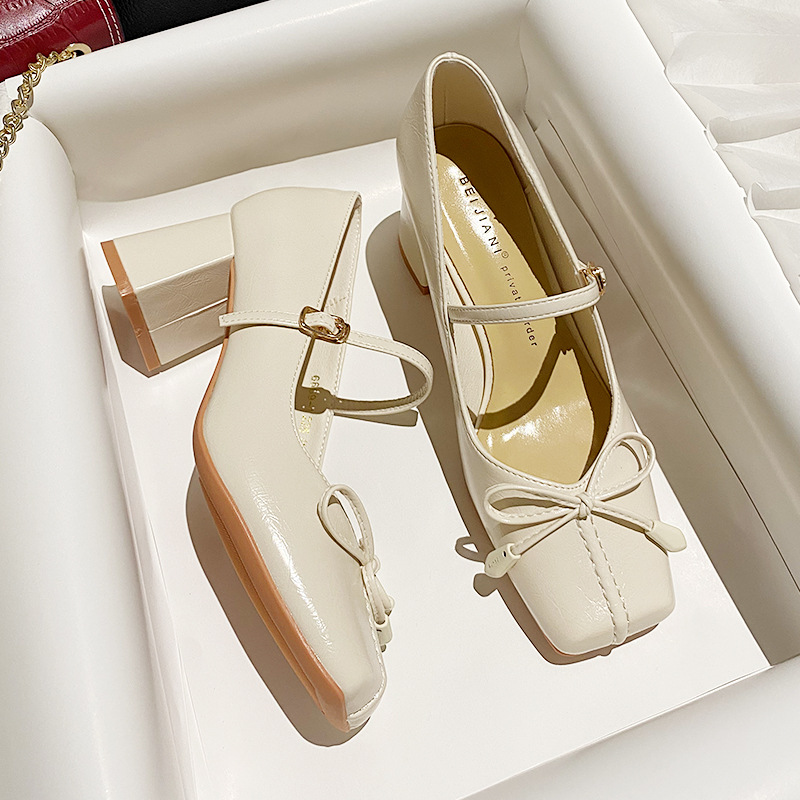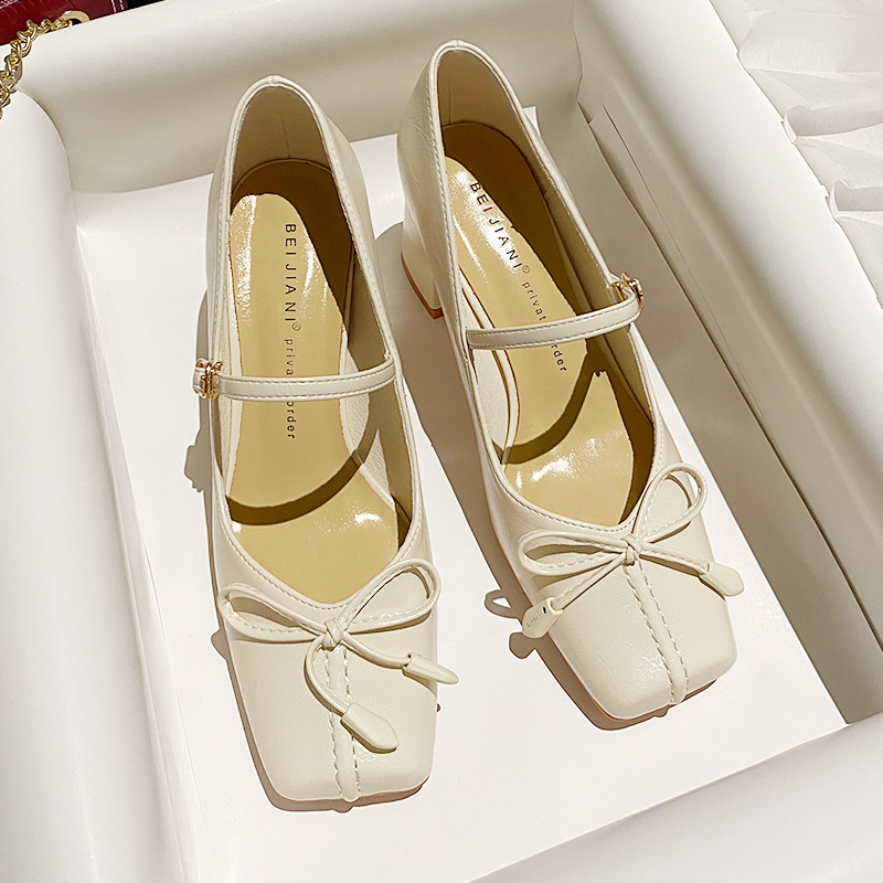 气质米白色蝴蝶结方头软皮玛丽珍鞋女新款一字带粗跟单鞋