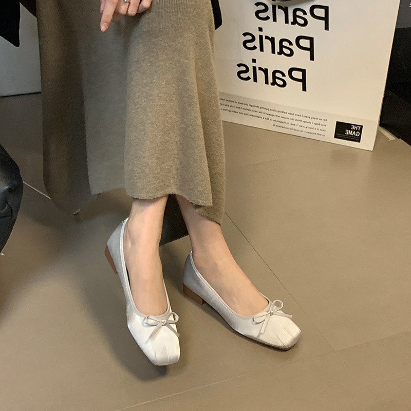 温柔绸缎方头芭蕾舞鞋春季小众蝴蝶结粗跟浅口瓢鞋