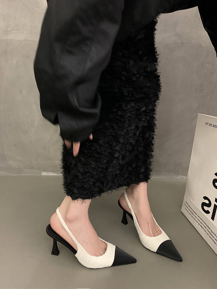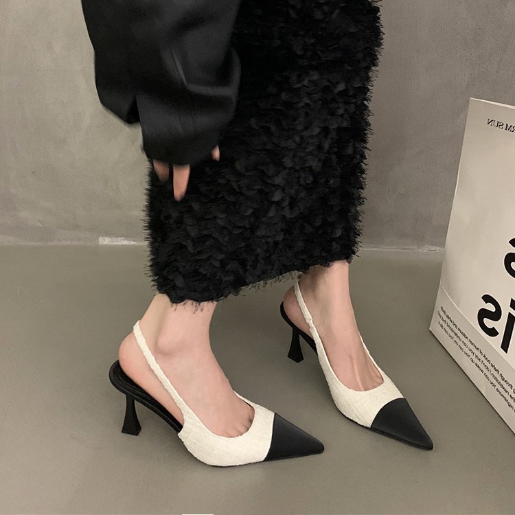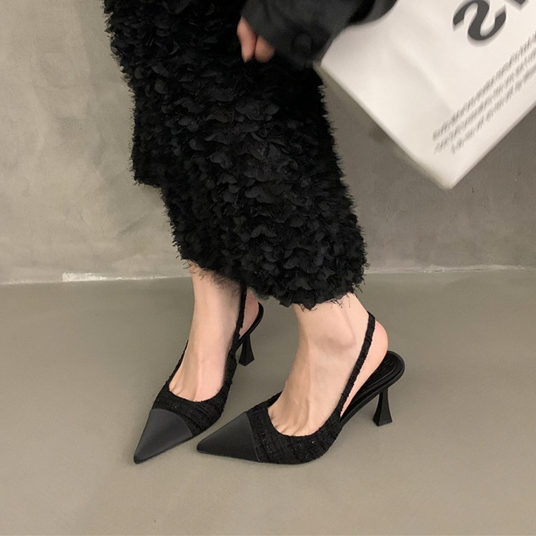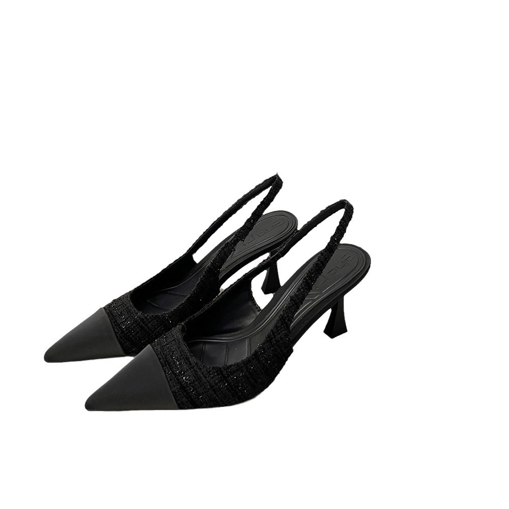 小香风法式细跟高跟鞋尖头包头后空绊带凉鞋女夏季新款配裙子浅