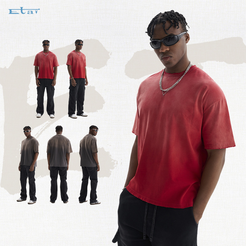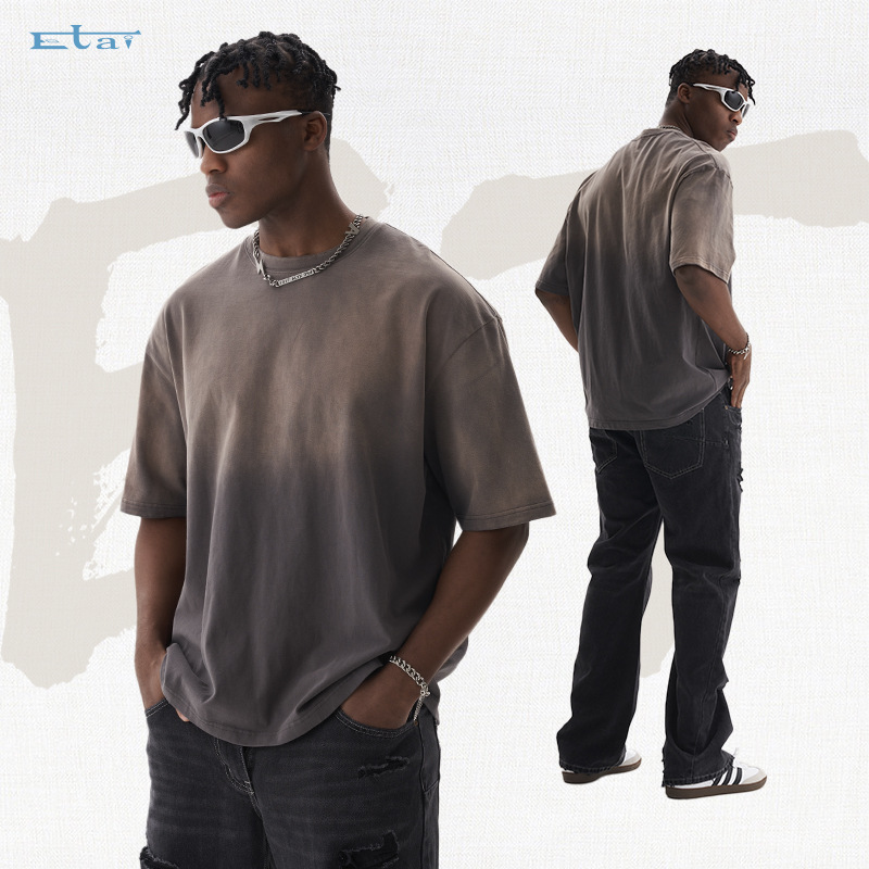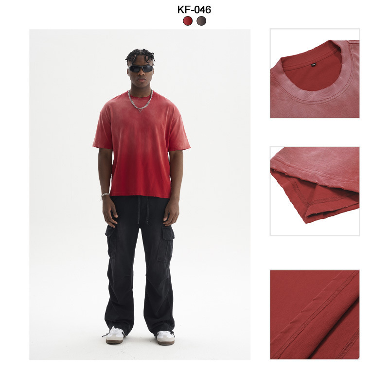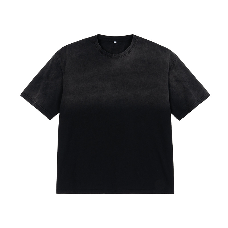 休闲街头水洗渐变T恤100%棉复古做旧T恤高品质喷马骝渐变褪色短袖