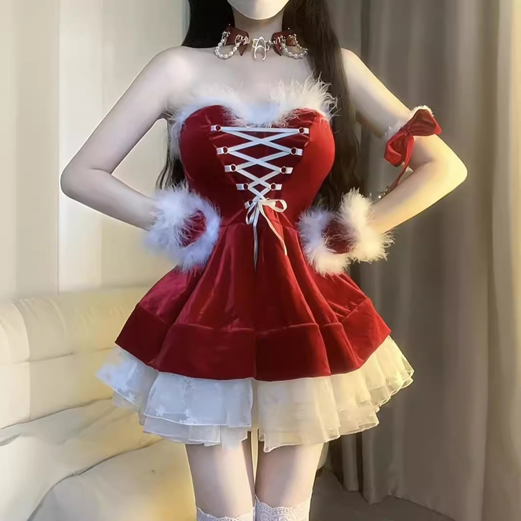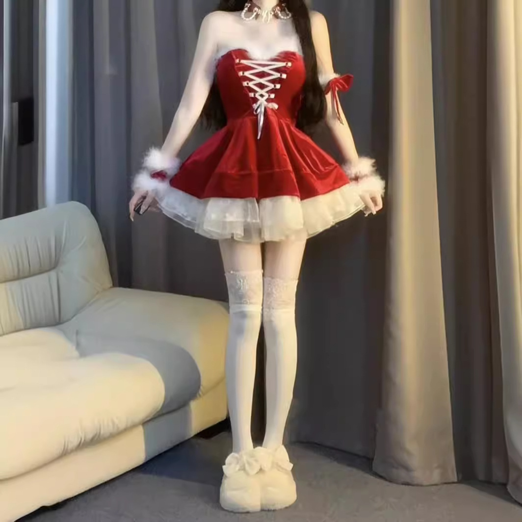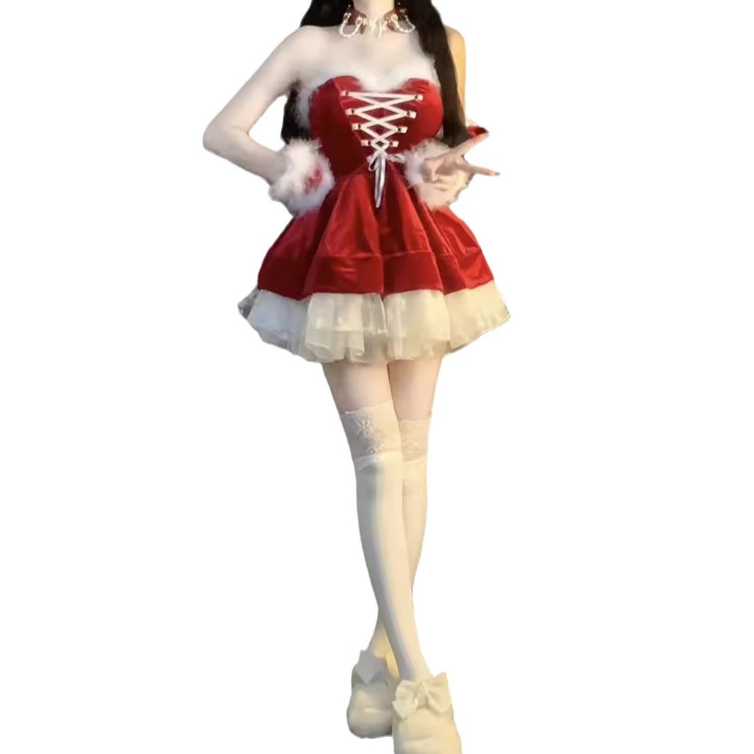 纯欲性感圣诞战袍收腰显瘦丝绒连衣裙氛围感红色短裙
