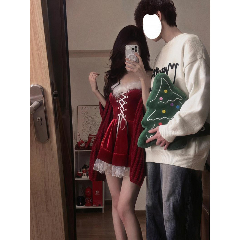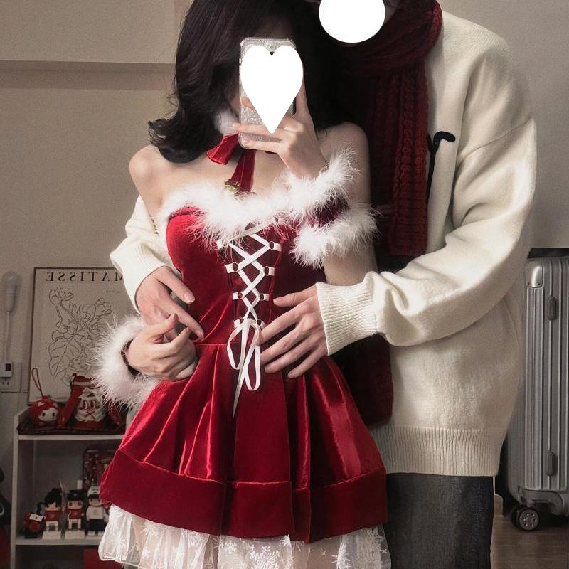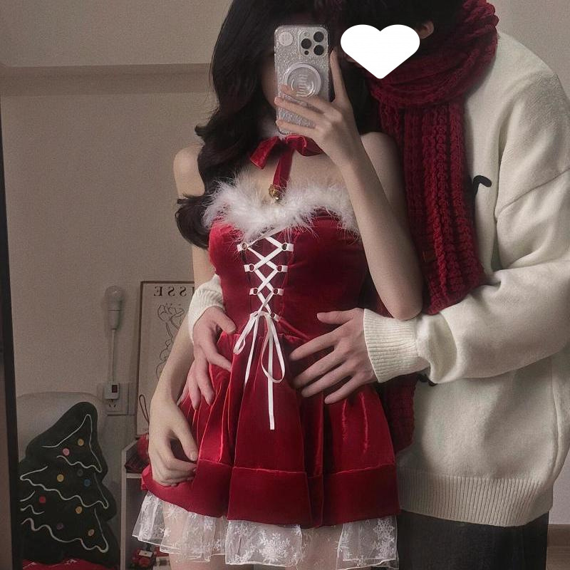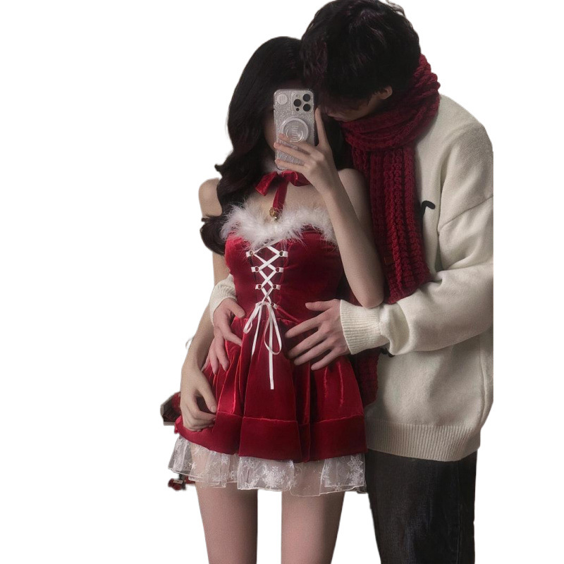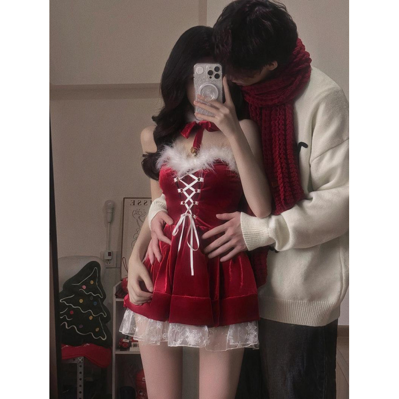 圣诞战袍纯欲风性感丝绒连衣裙女收腰蓬蓬裙