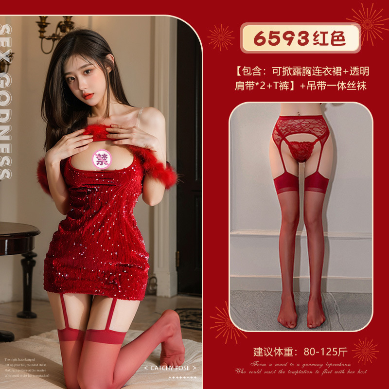 红【连衣裙+透明肩带*2+T裤】+7365吊带一体丝袜