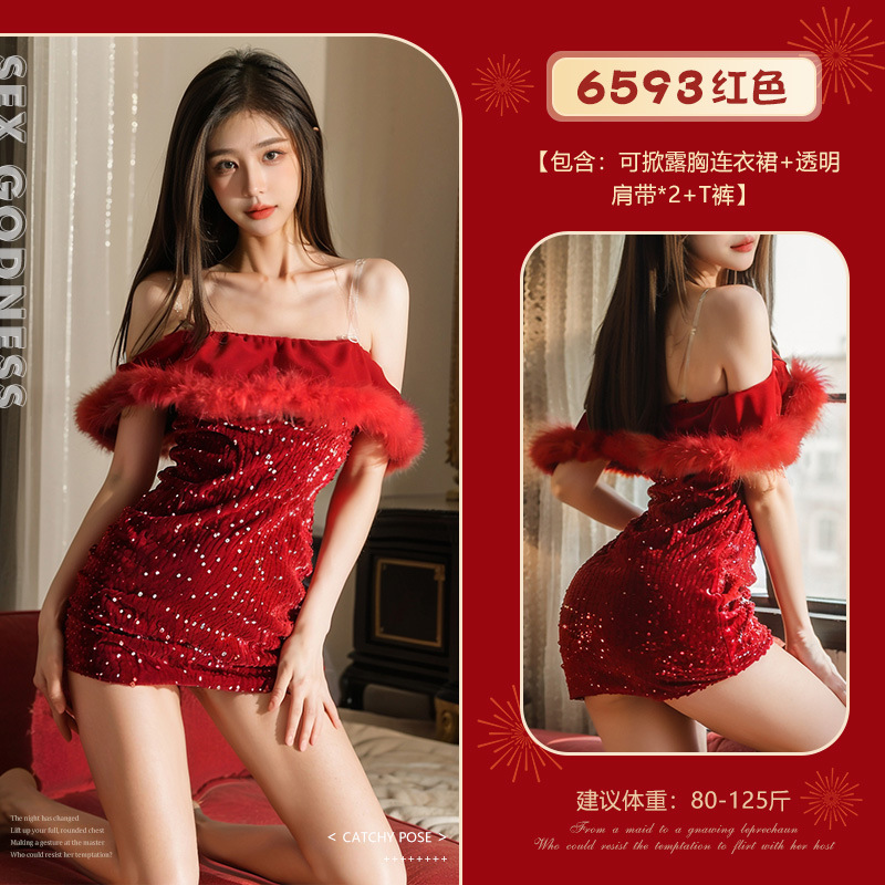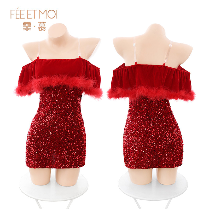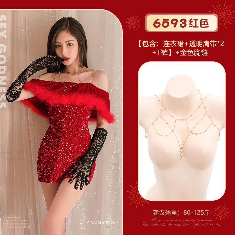 一字肩挖空露胸亮片裙情趣内衣成人魅惑性感制服