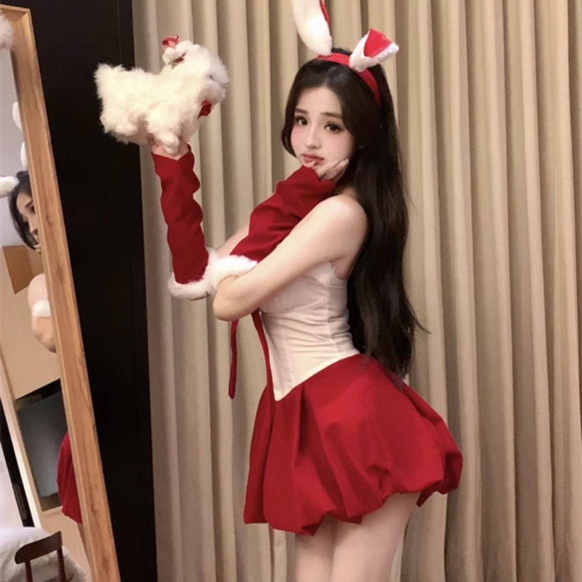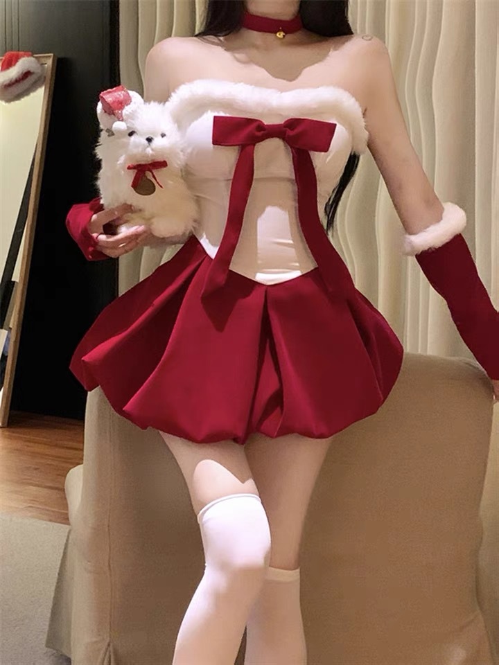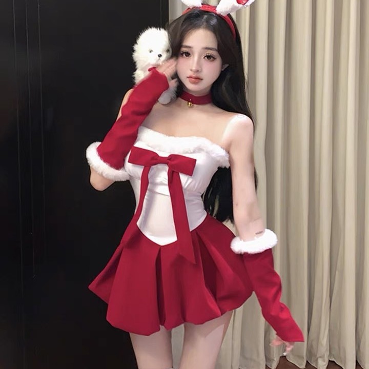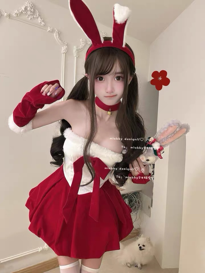 圣诞节服装氛围感战袍穿搭丝绒抹胸红色连衣裙女兔女郎cos小礼裙