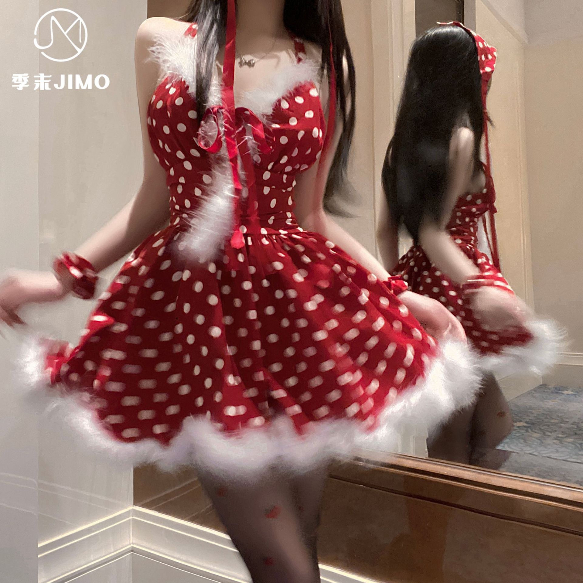 红色波点圣诞氛围感V领波点拼接毛毛蓬蓬公主裙纯欲情趣内衣