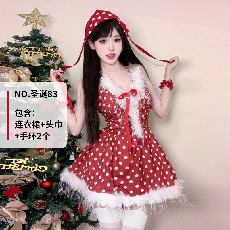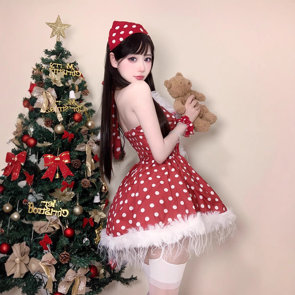 圣诞服节睡裙女春季新年战袍波点法式仙子毛边挂脖蓬蓬裙主播制服