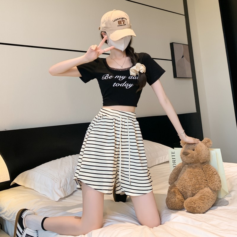 条纹短裤女夏季薄款新款韩版阔腿裤高腰显瘦百搭五分运动裤子
