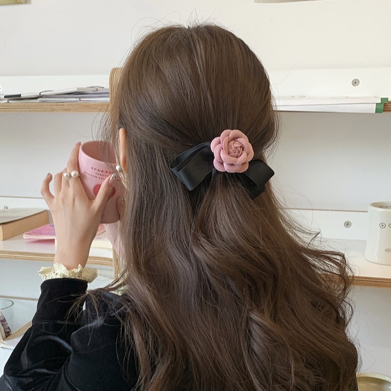 新款甜美温柔山茶花朵蝴蝶结发夹小香风后脑勺顶夹发饰女