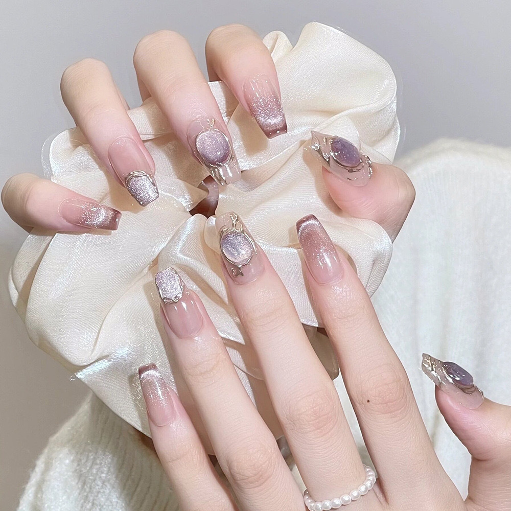 巴洛少女纯手工穿戴甲手绘高级感美甲贴片猫眼冰透裸色爆闪甲