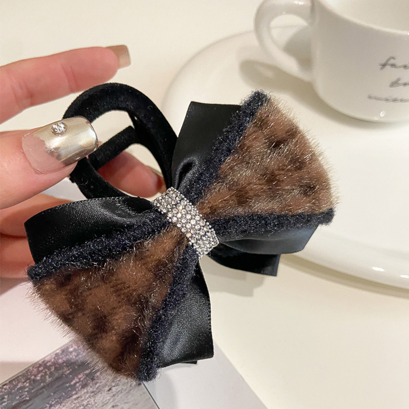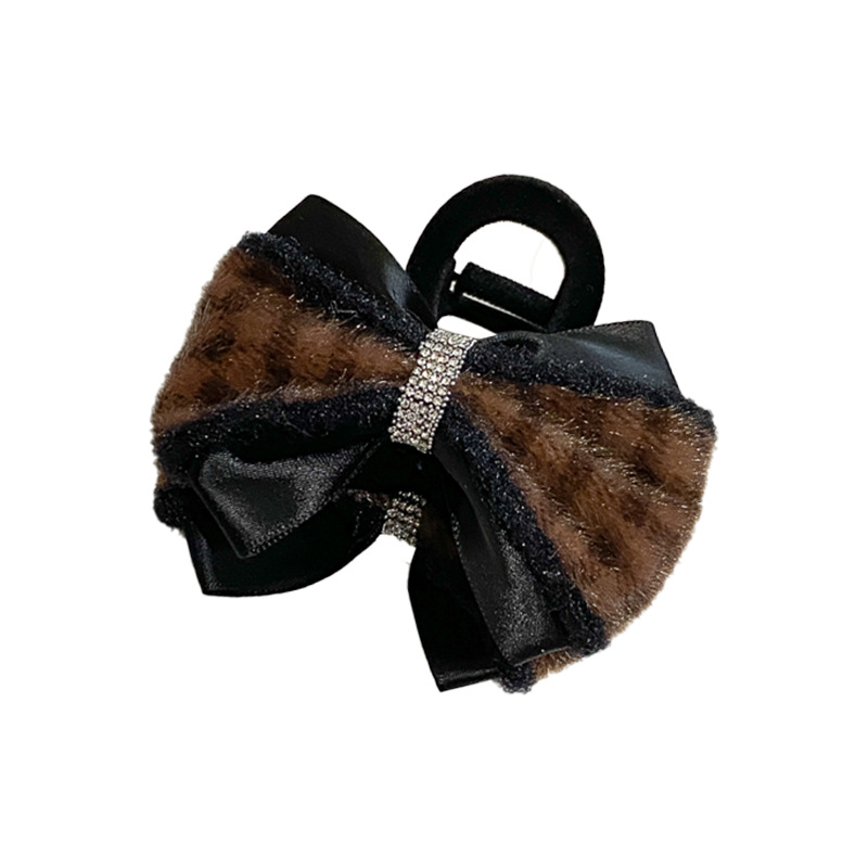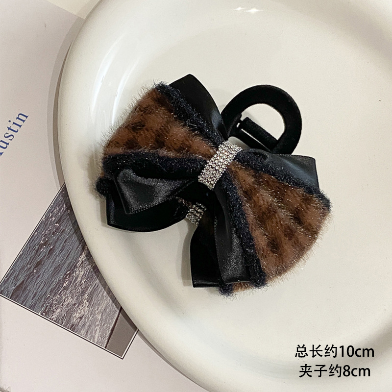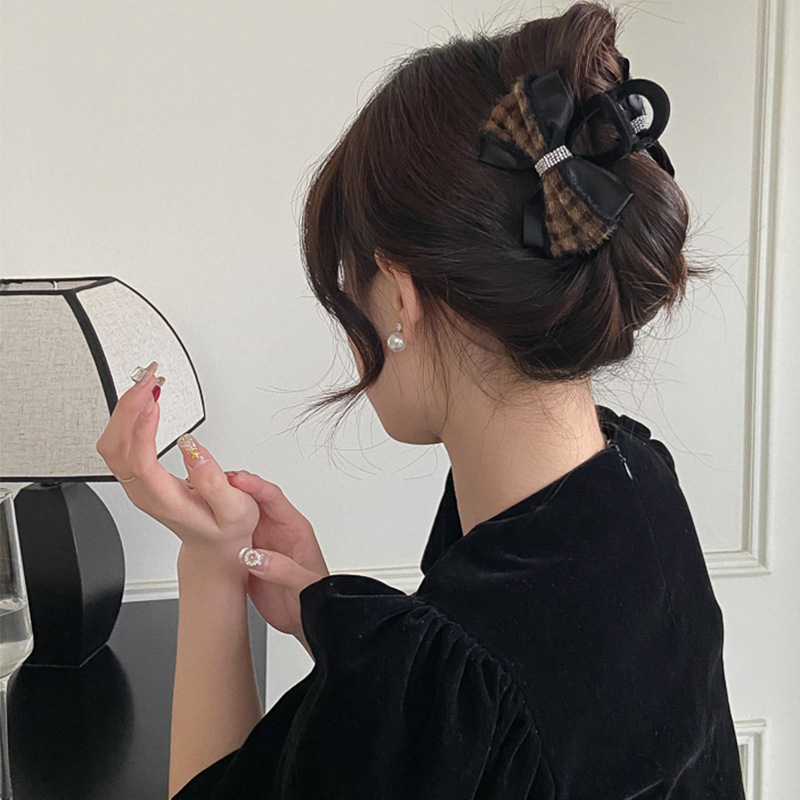 棕色格子毛绒蝴蝶结抓夹鲨鱼夹后脑勺中号发量少盘发发夹子
