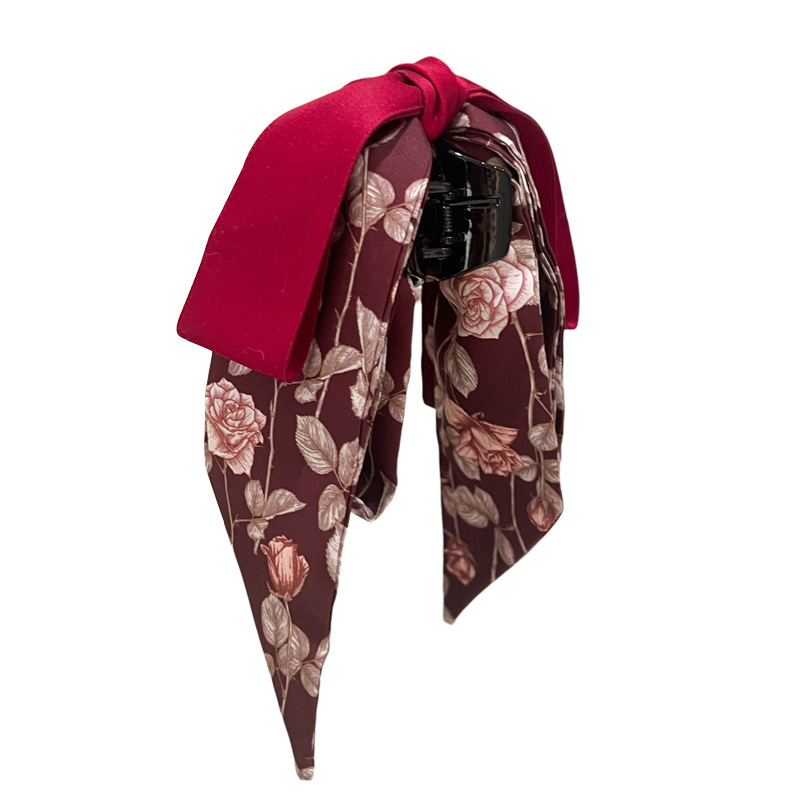 新中式复古酒红玫瑰花飘带蝴蝶结抓夹新款时尚百搭后脑勺半扎发卡