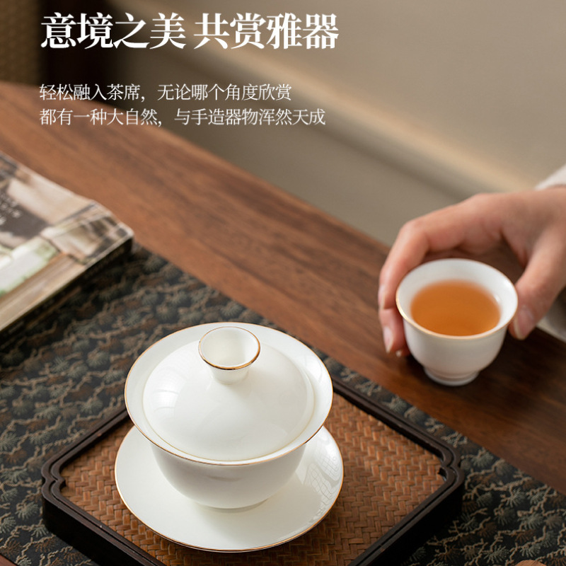 茶具羊脂玉三才盖碗套组不烫手茶杯金边茶碗家用盖碗