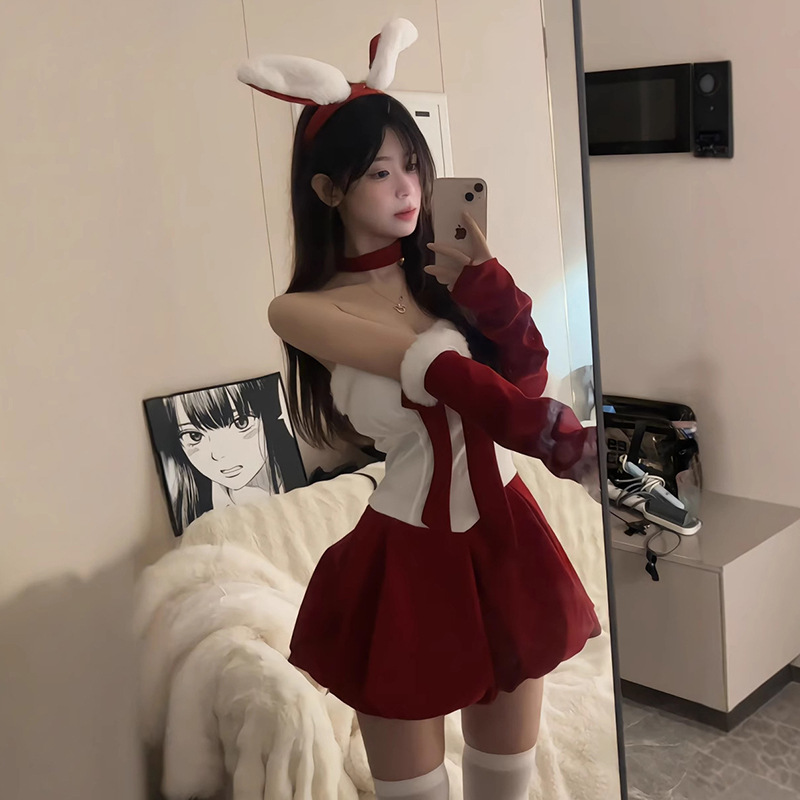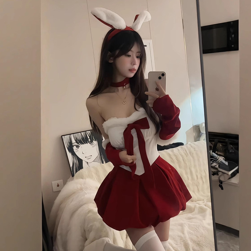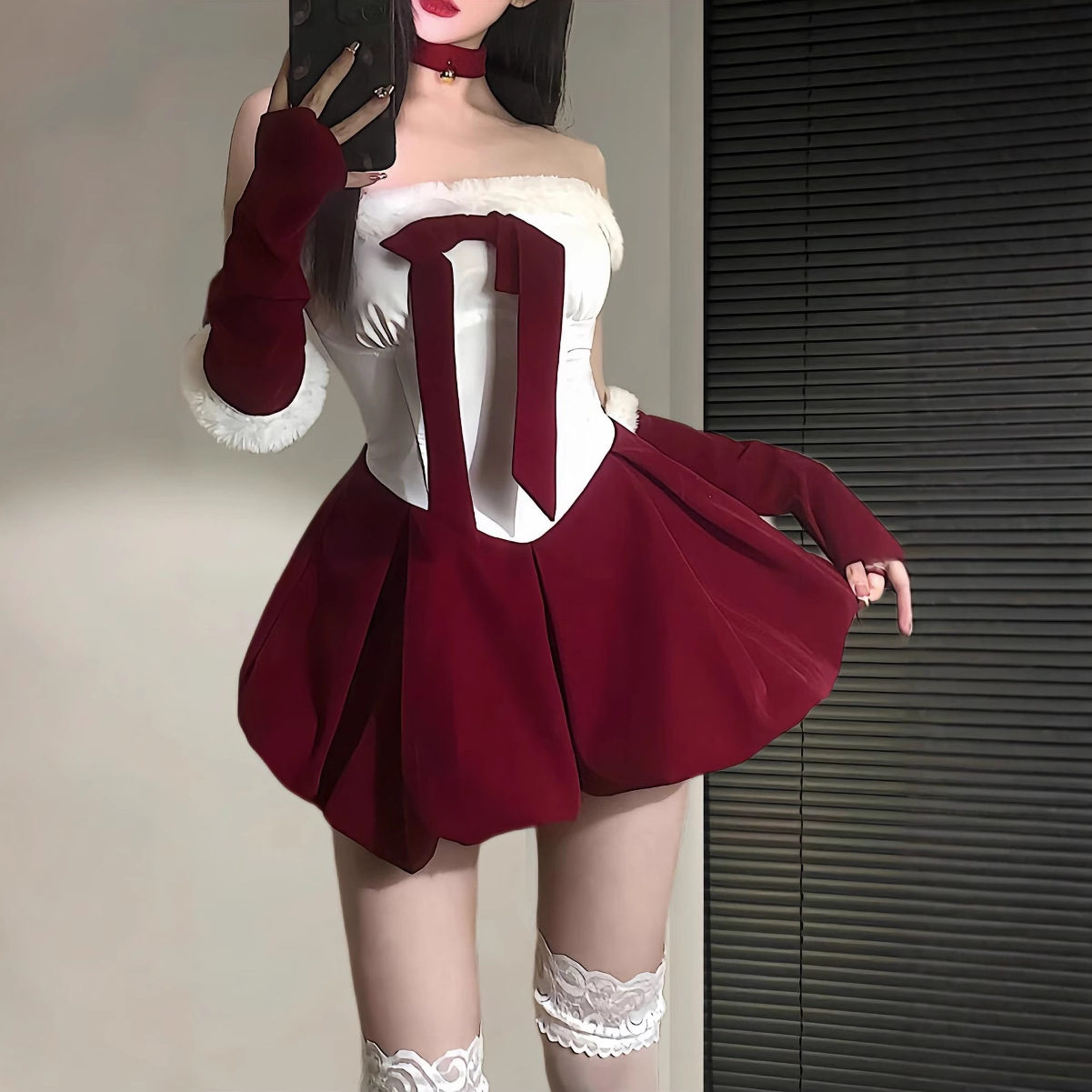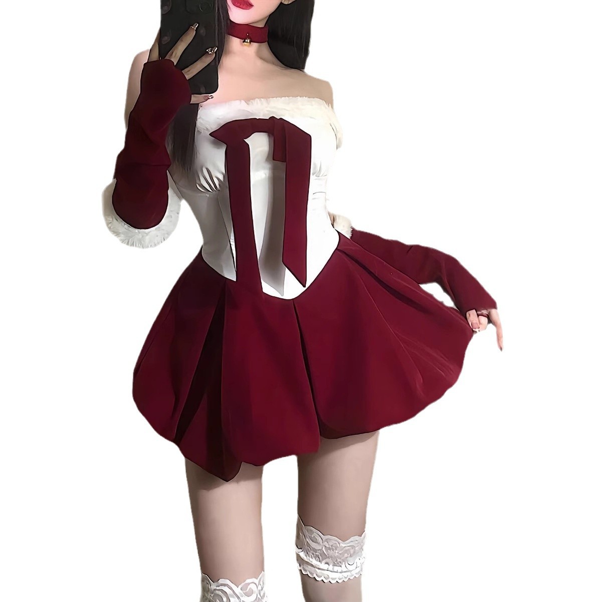战袍性感圣诞圣诞节甜心制服套装cos抹胸丝绒短裙蝴蝶结连衣裙