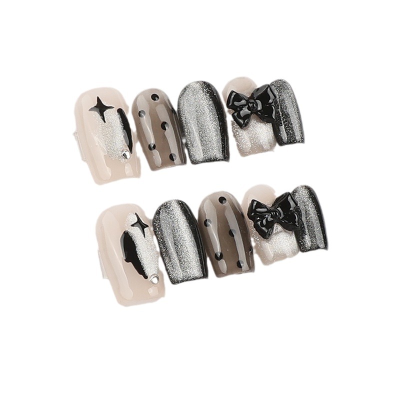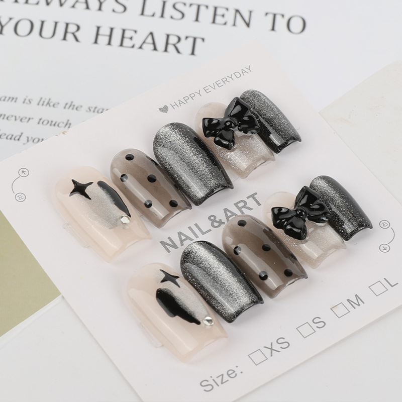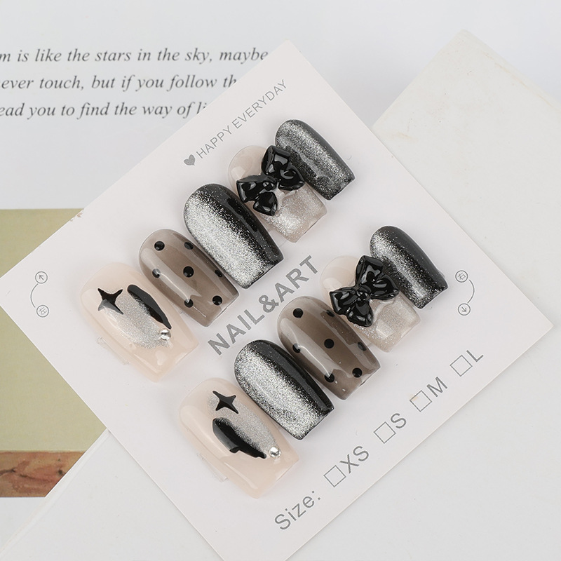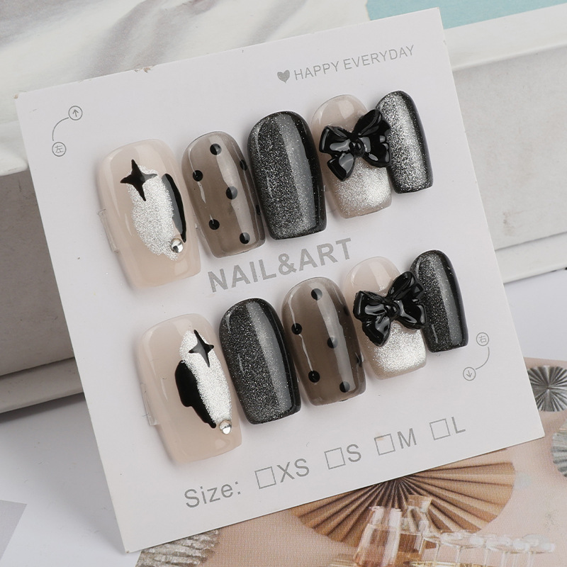 光疗美甲蝴蝶结黑色波点指甲贴手作穿戴甲美甲贴片手工穿戴甲