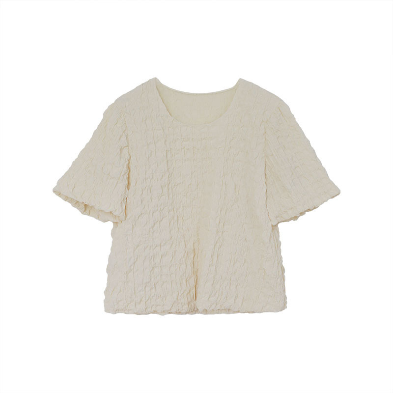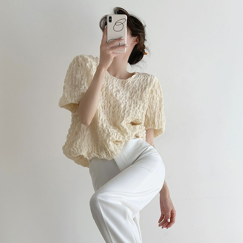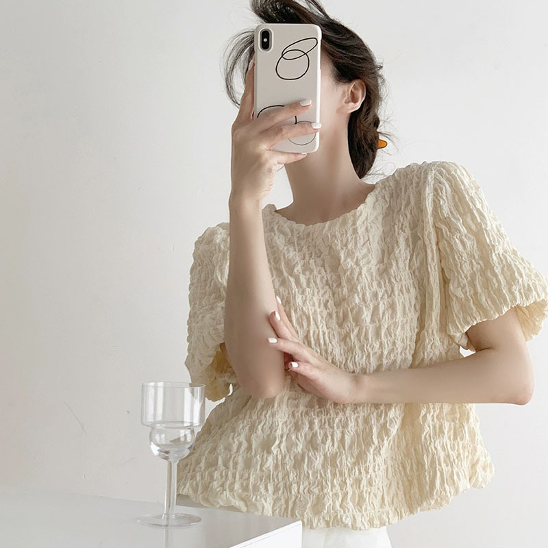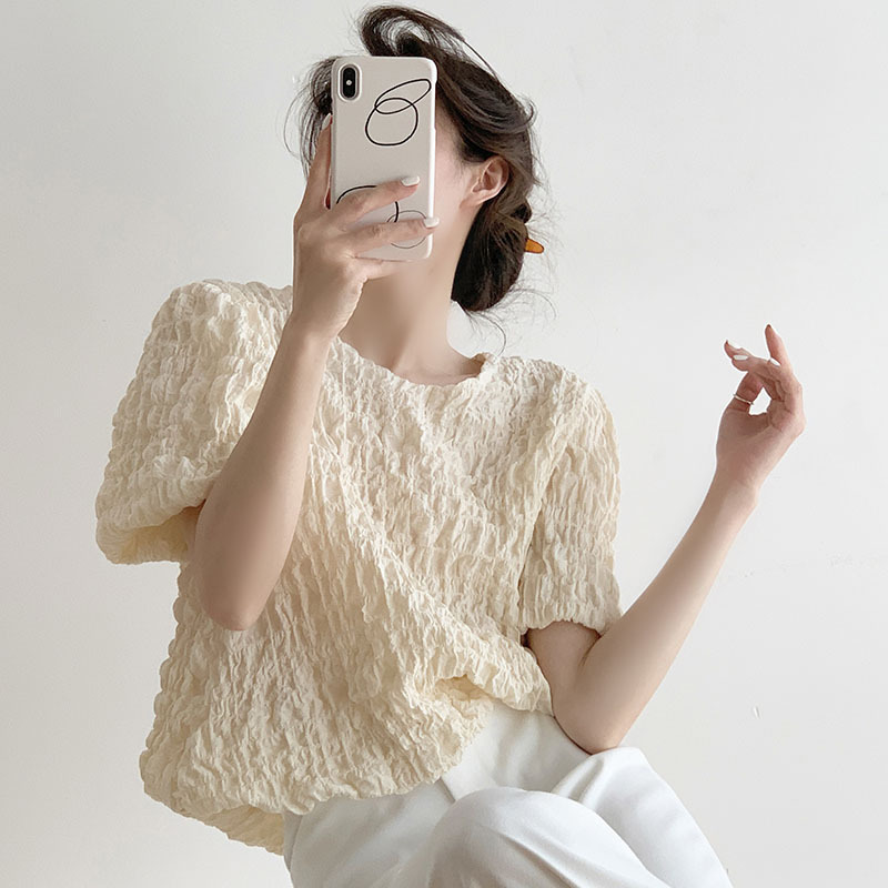 夏装新款法式泡泡褶皱t恤女宽松气质体恤上衣圆领短袖衣服女