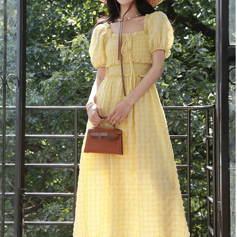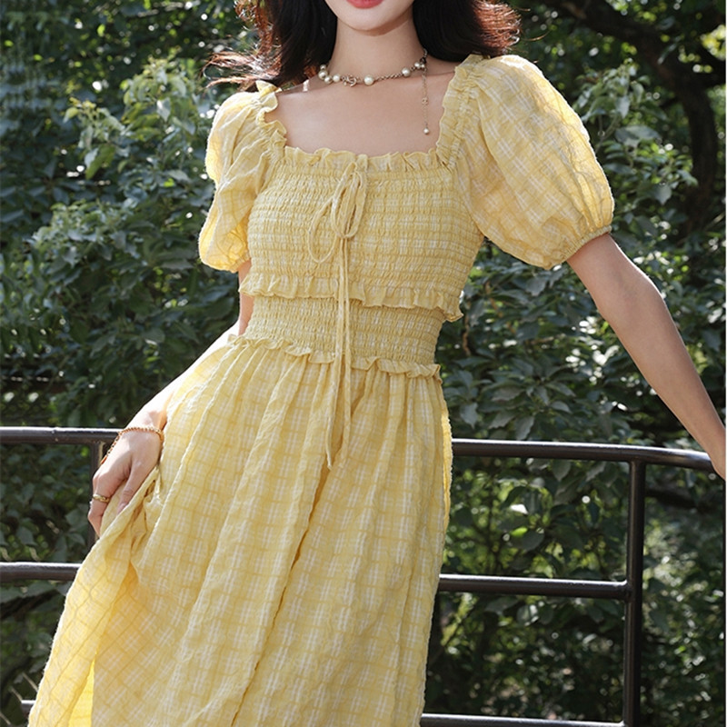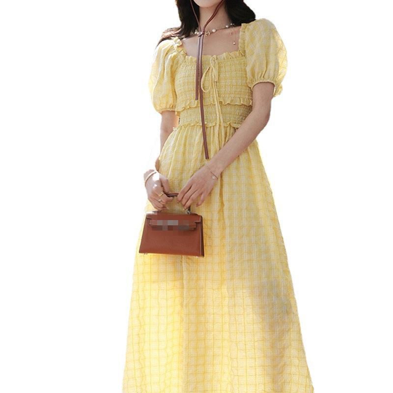 连衣裙女装夏季新款中长裙法式短袖甜美风方领荷叶边裙子