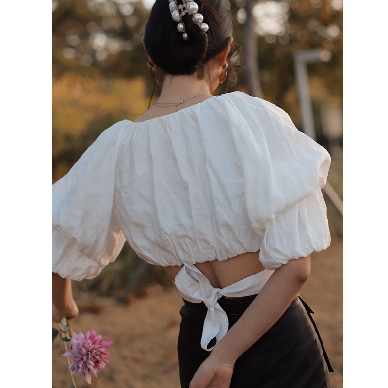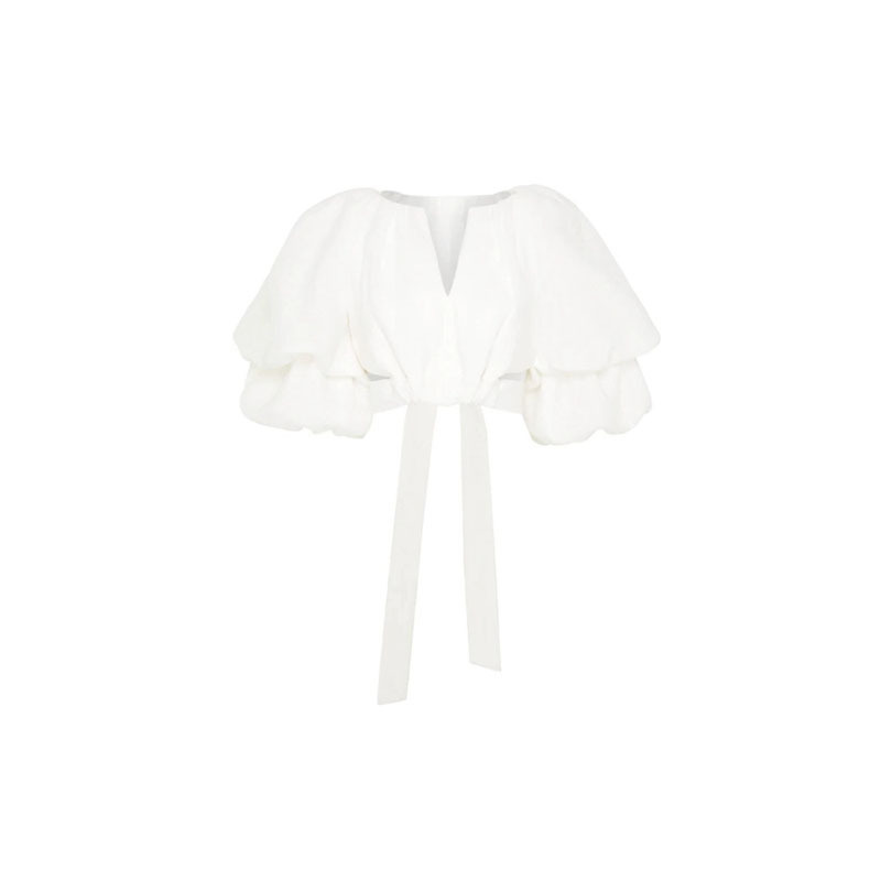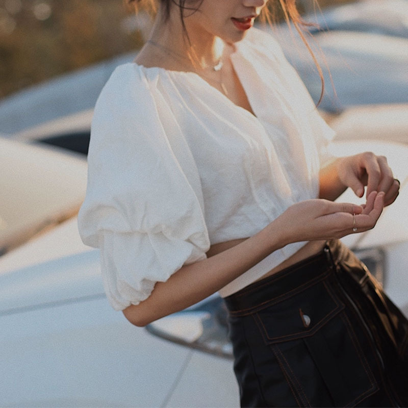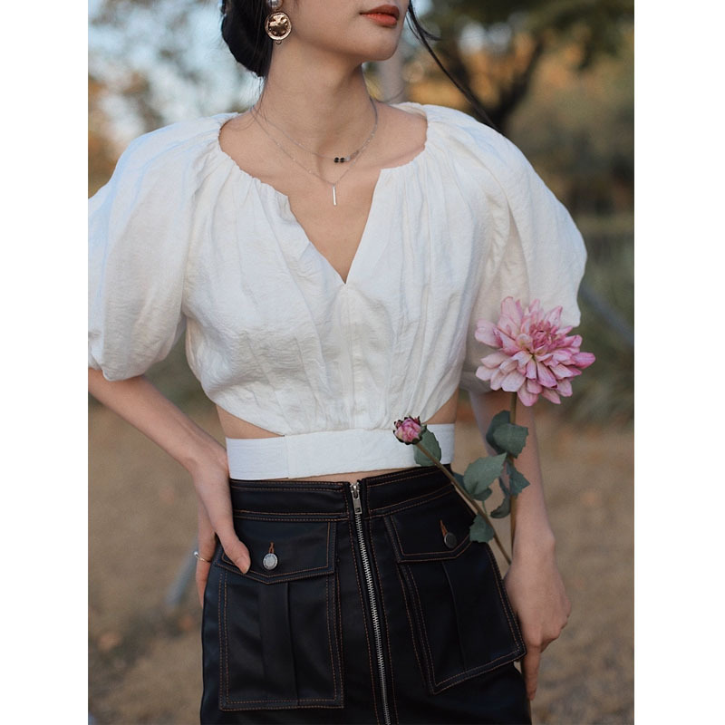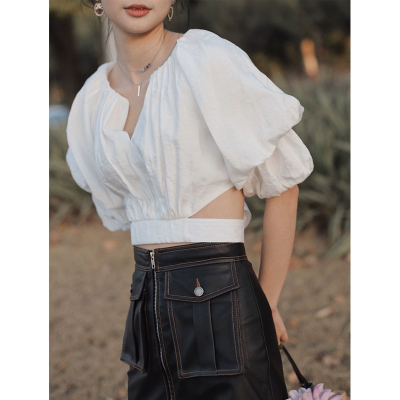 夏季新品小众设计aje风泡泡袖色收腰系带v领露腰短款上衣