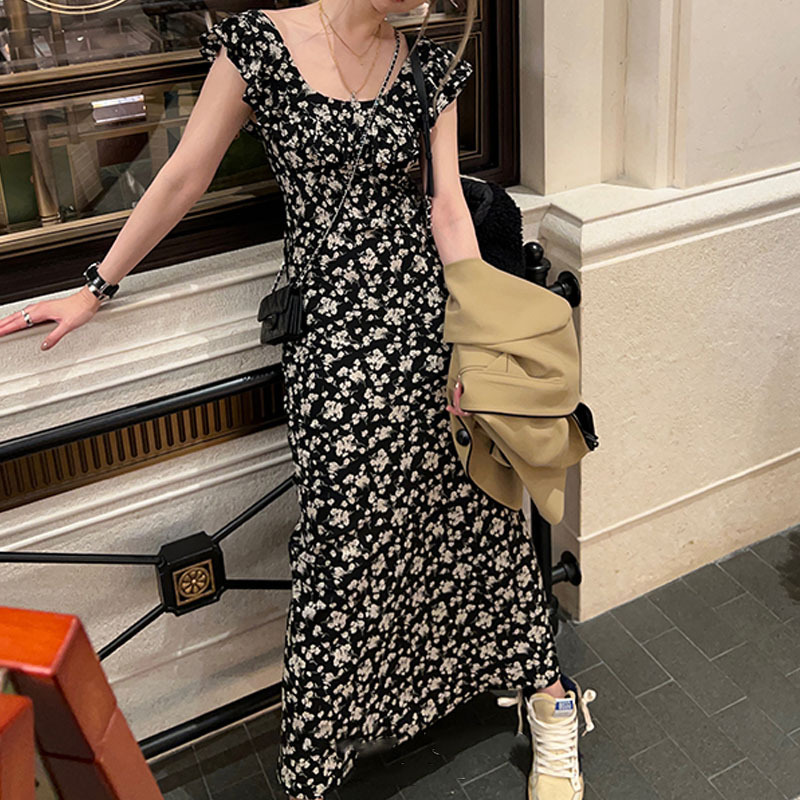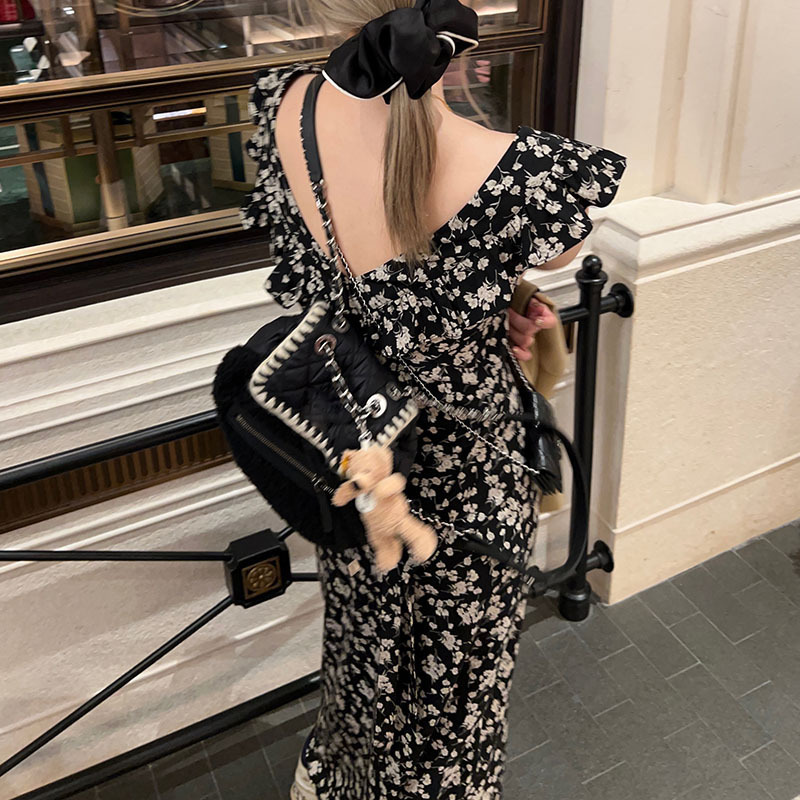 夏季约会玫瑰岛碎花黑色连衣裙女春夏中长款荷叶边裙子