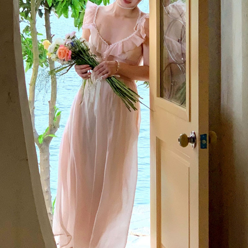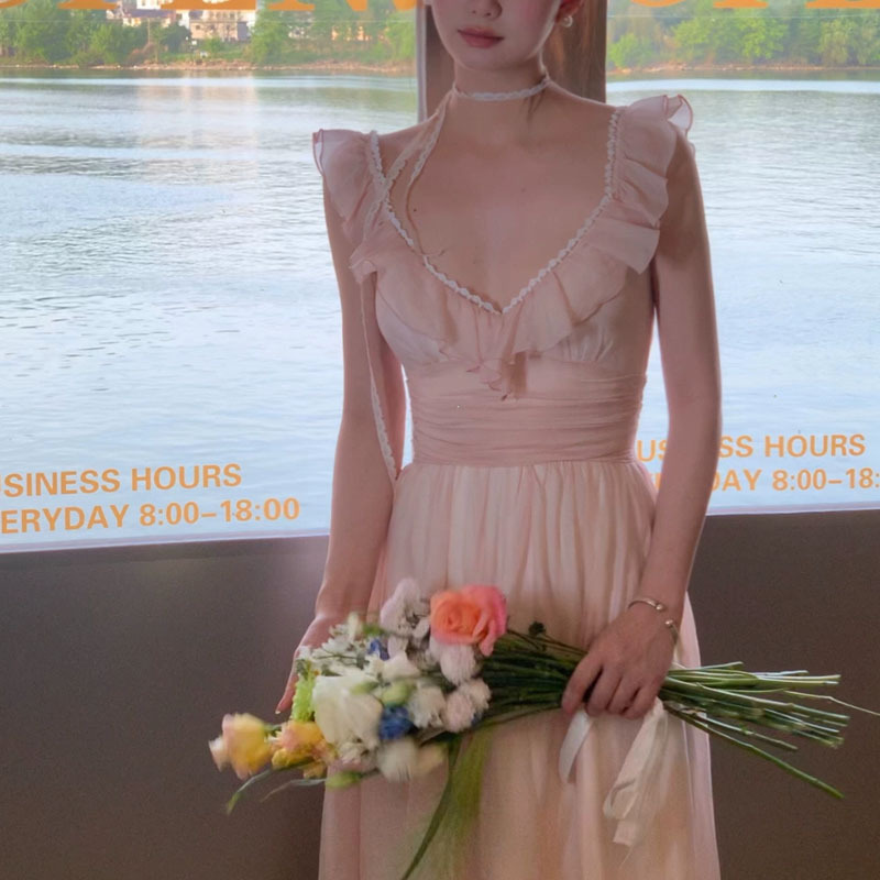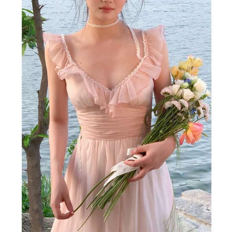 大v领荷叶边蕾丝边抽褶设计感小仙女甜美温柔连衣裙长裙夏季裙子