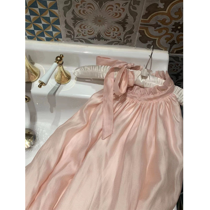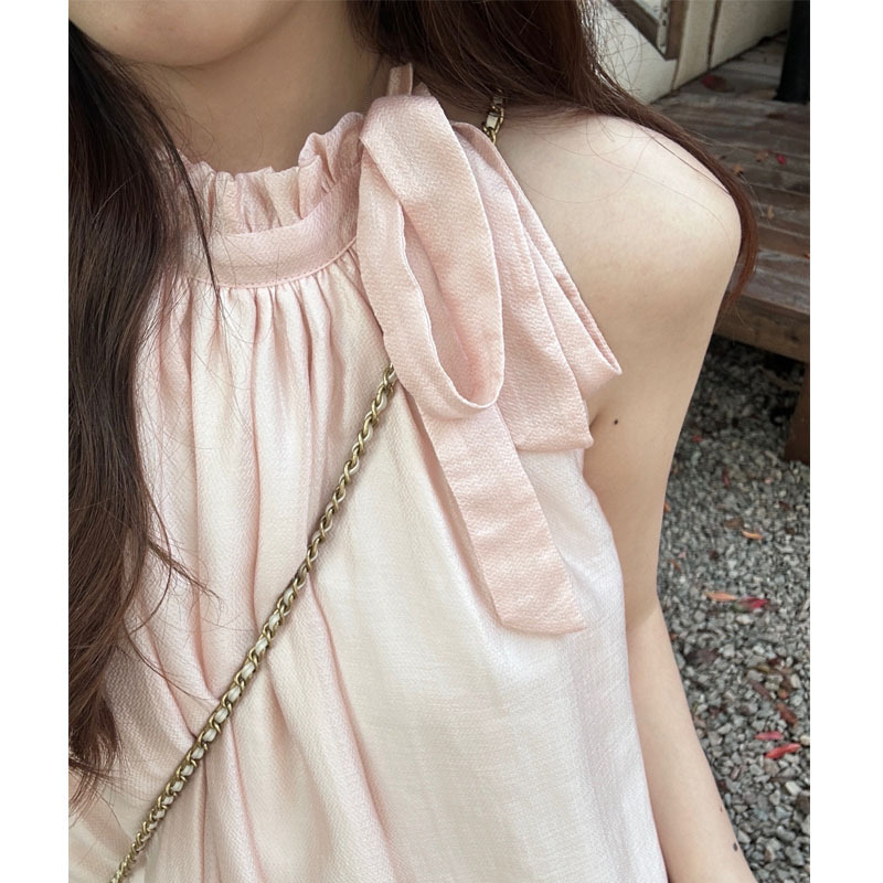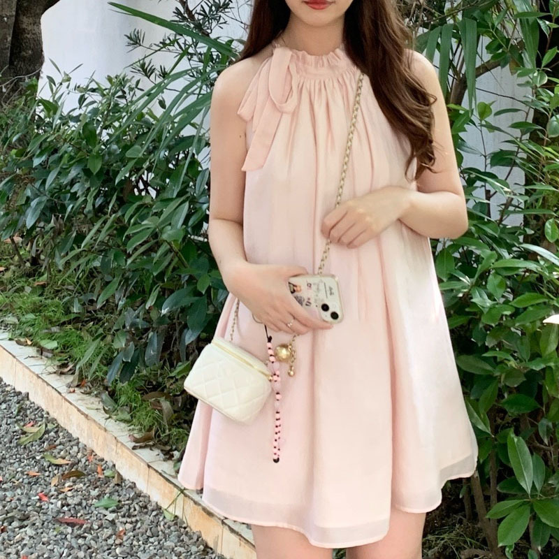 新款清冷感美女 系带法式挂脖夏季粉色系连衣裙气质女神裙子