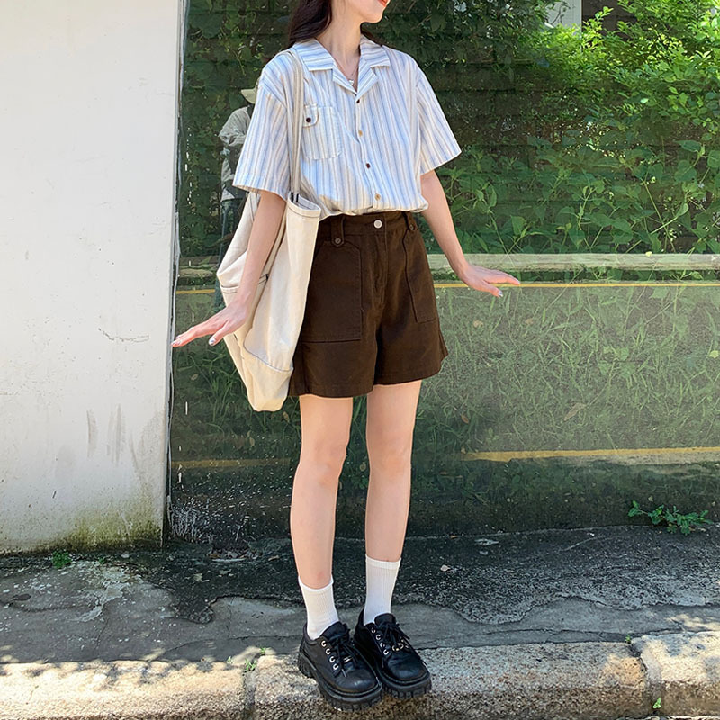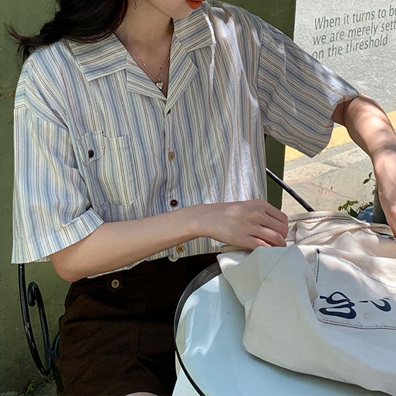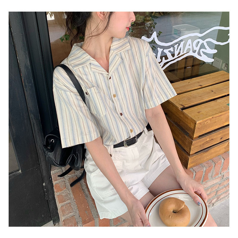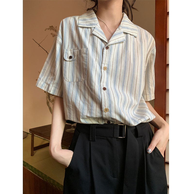日系清新蓝条纹衬衫夏季女古巴领短袖衬衣休闲宽松衣服复古上衣女