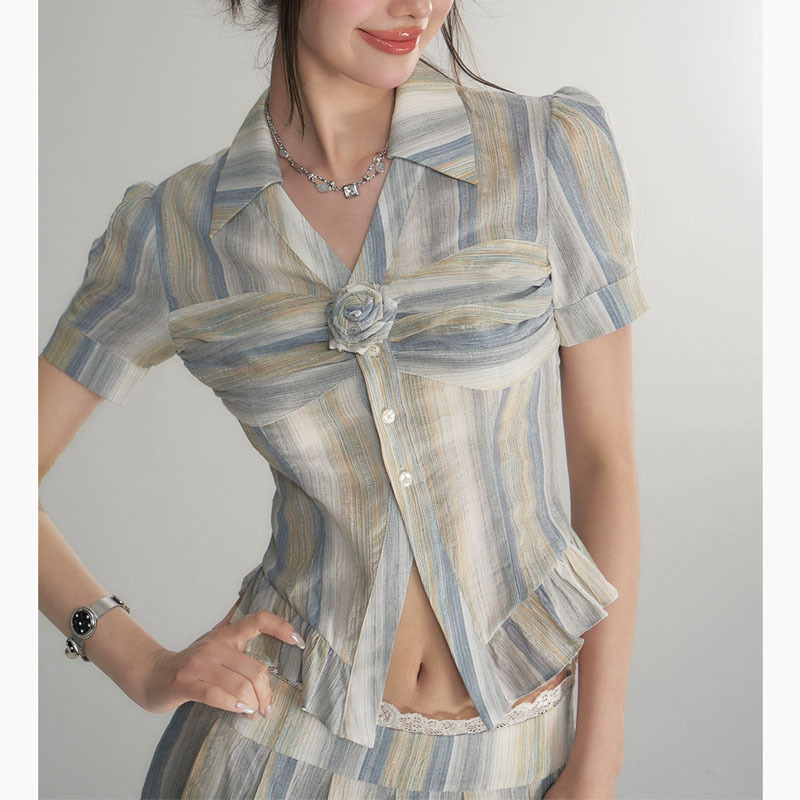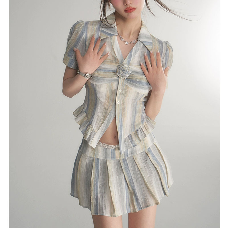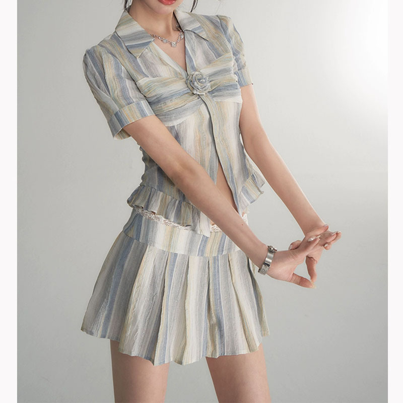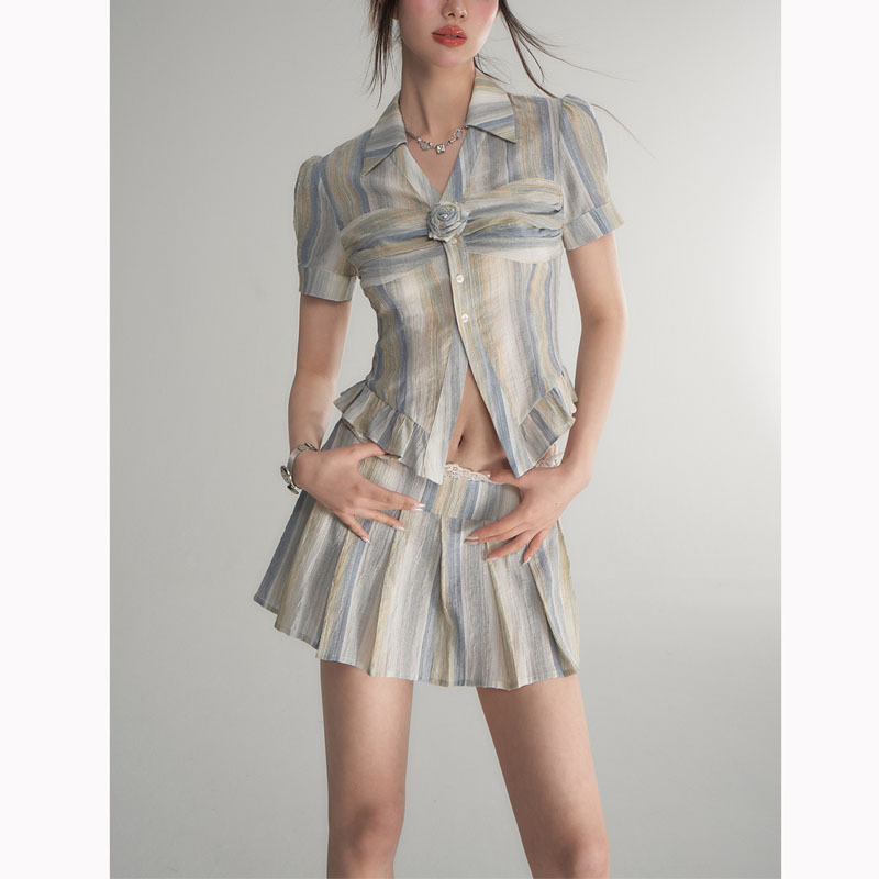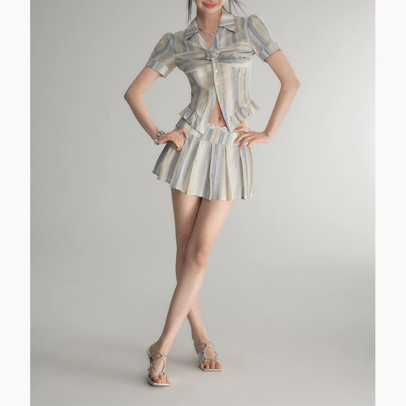 jue美奶系穿搭夏天条纹学院风衬衫百褶裙两件套套装