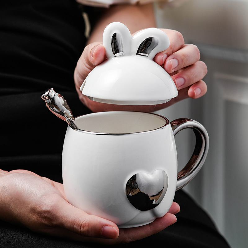 马克杯兔子伴手礼陶瓷杯水杯电镀银色高颜值高级感带盖子勺子礼物