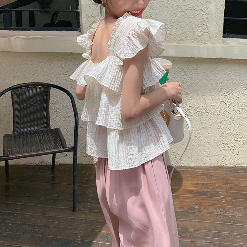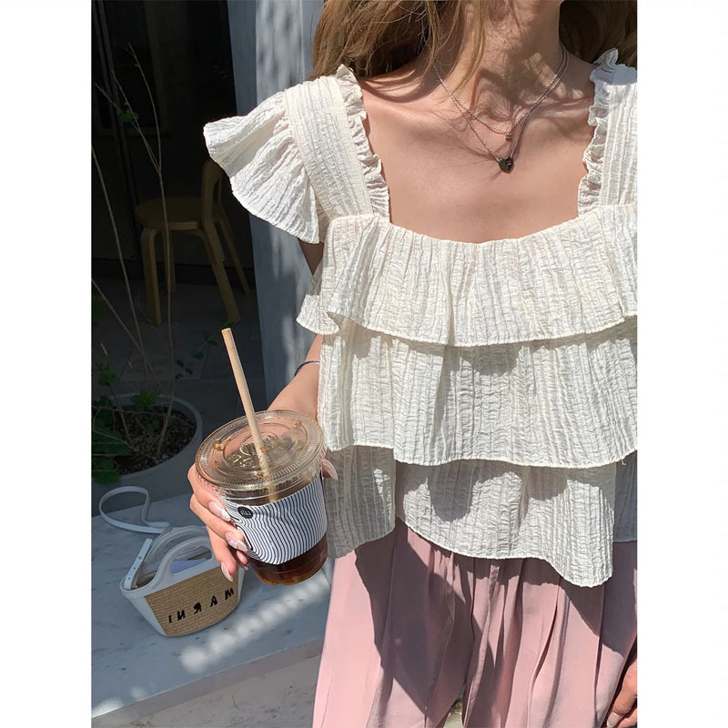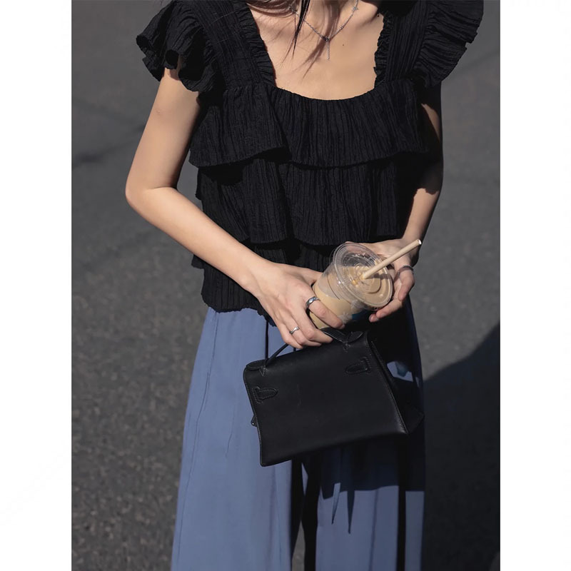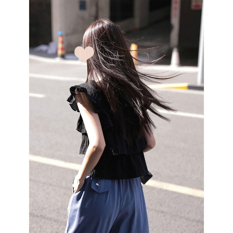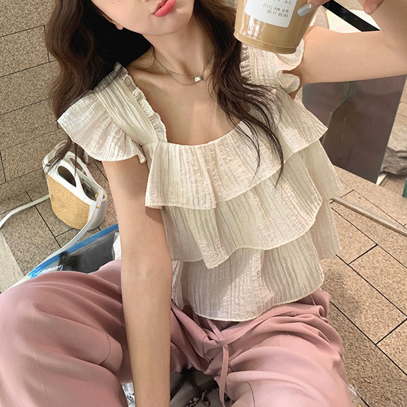 夏季款柔软天si短款宽松色雪纺小衫女方领无袖显瘦薄上衣
