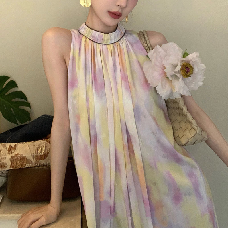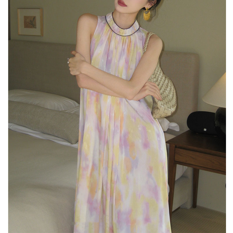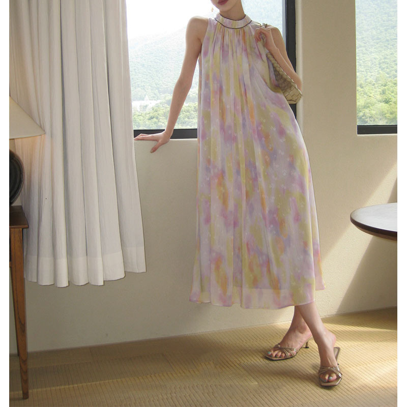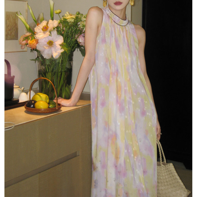 复古气质雪纺连衣裙女夏季年新款法式设计感小众无袖长裙裙子