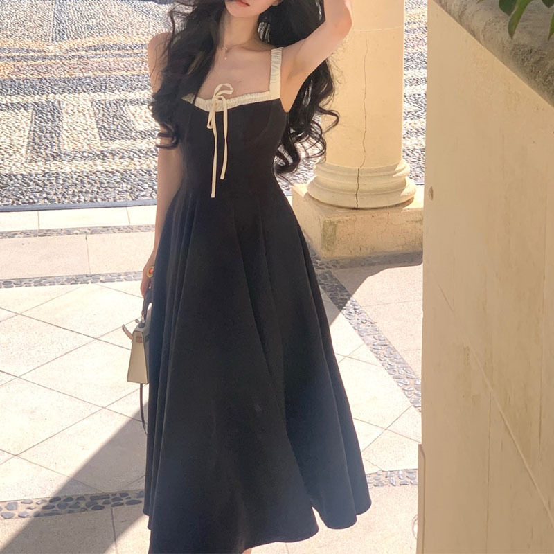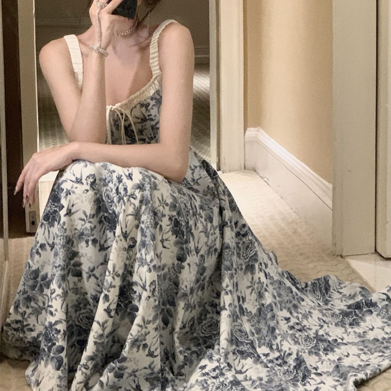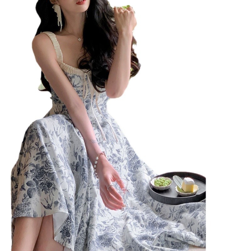 青花瓷吊带裙 女新款a字法式小众设计长裙子夏两色大摆连衣裙