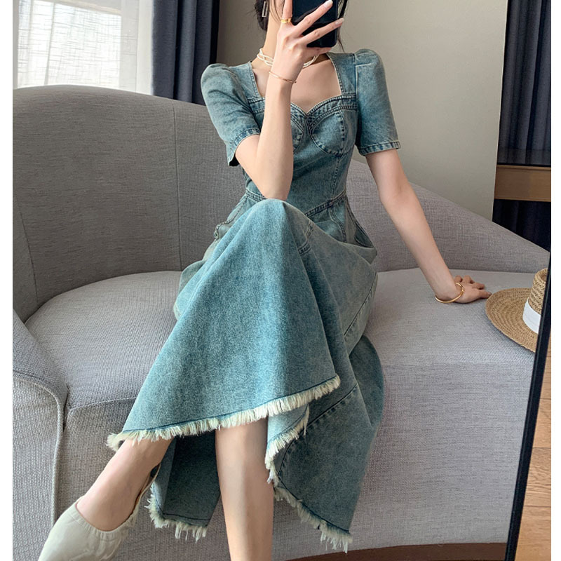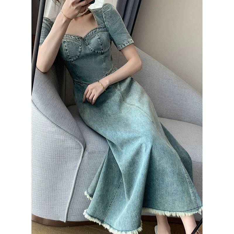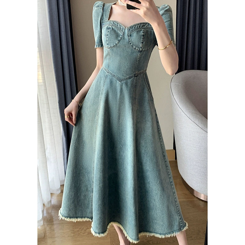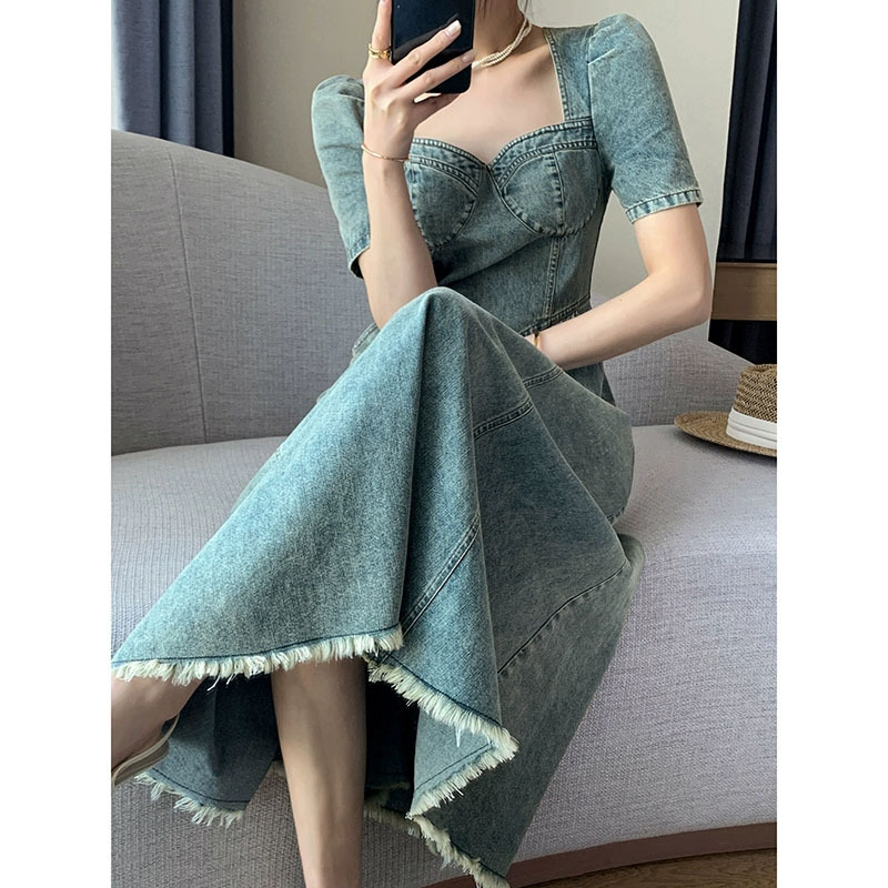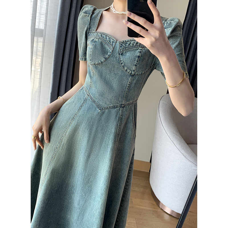 蓝色牛仔连衣裙女夏季新款短袖法式复古显瘦方领长裙裙子女装