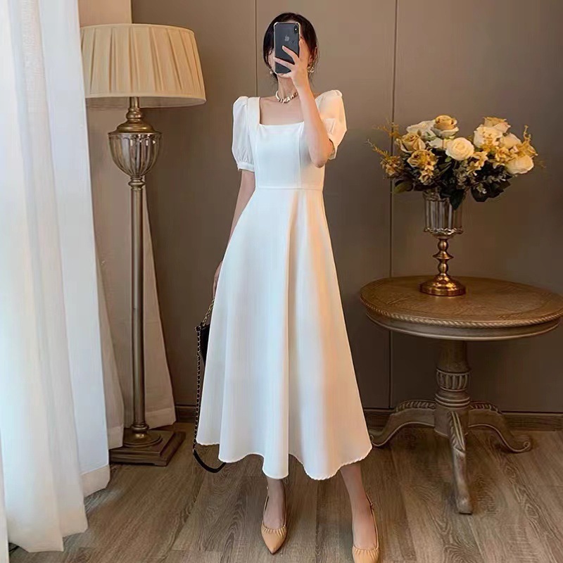 白色方领连衣裙女夏新款法式复古收腰显瘦女装赫本风长款裙子