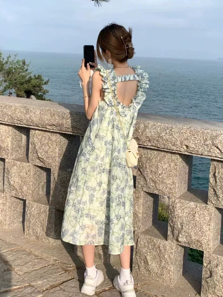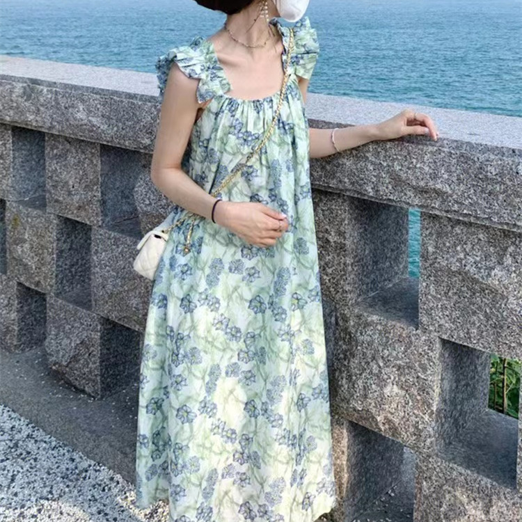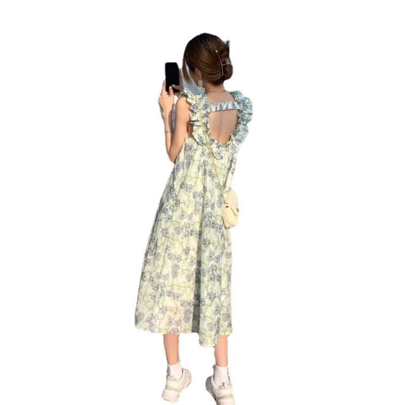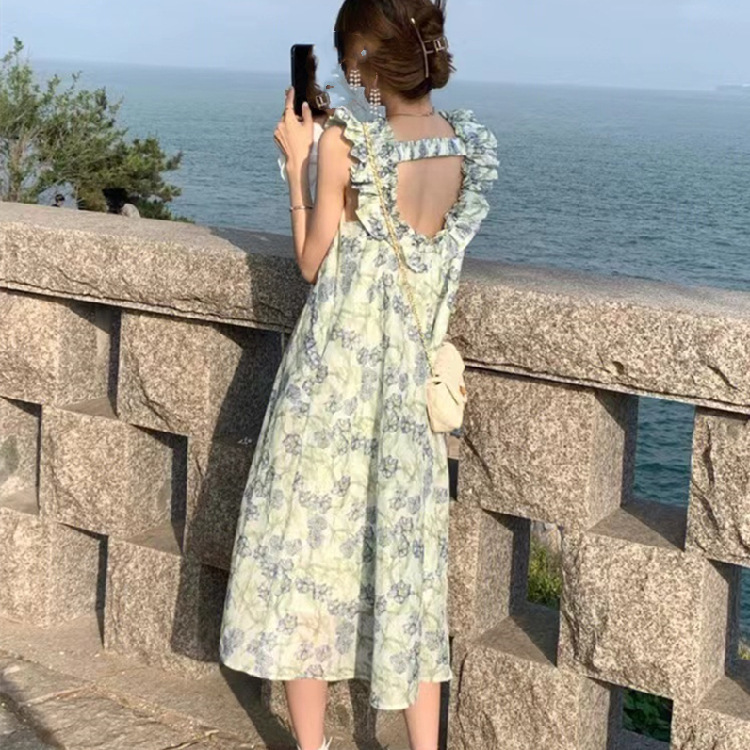 法式性感露背小飞袖碎花吊带连衣裙长裙女装夏季新款女裙子