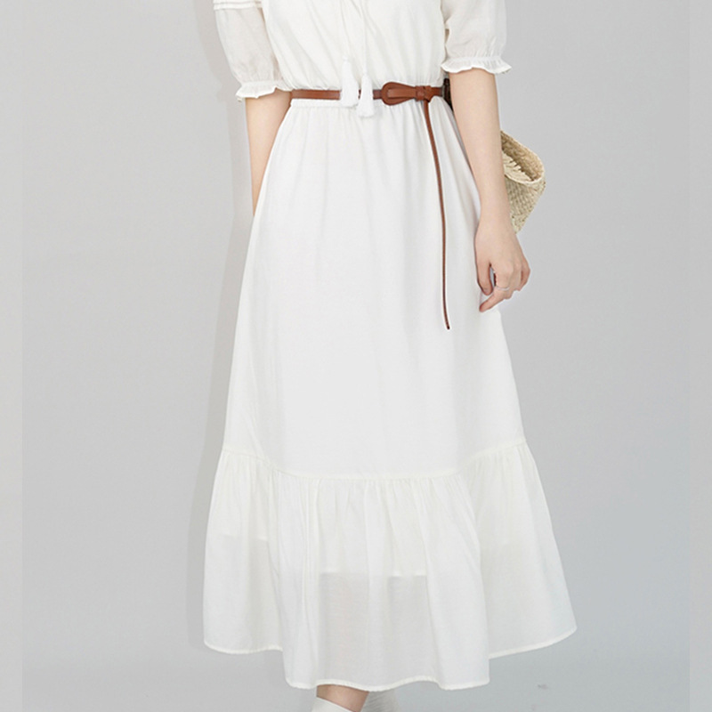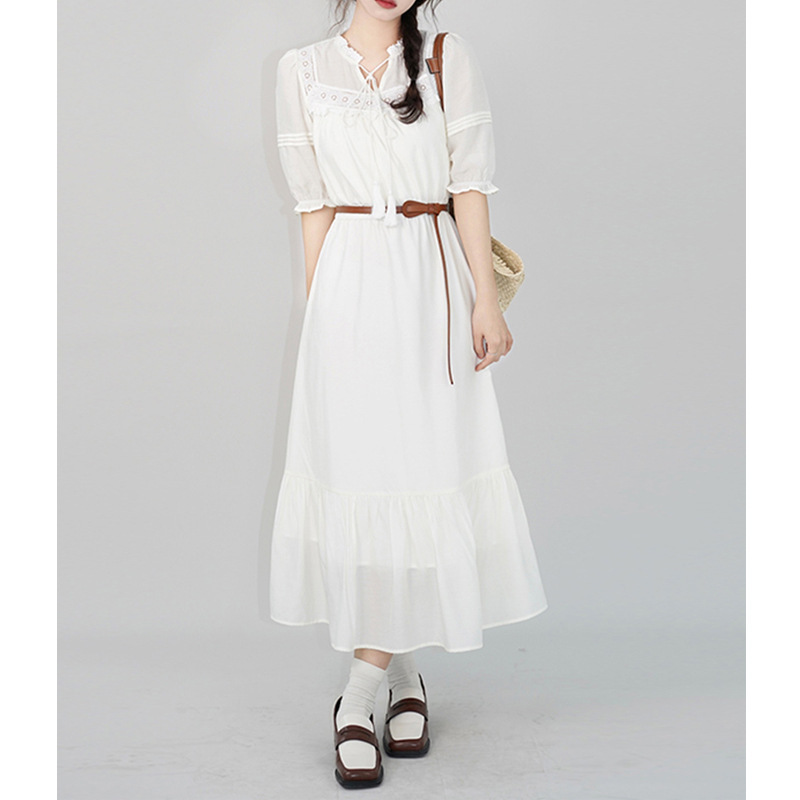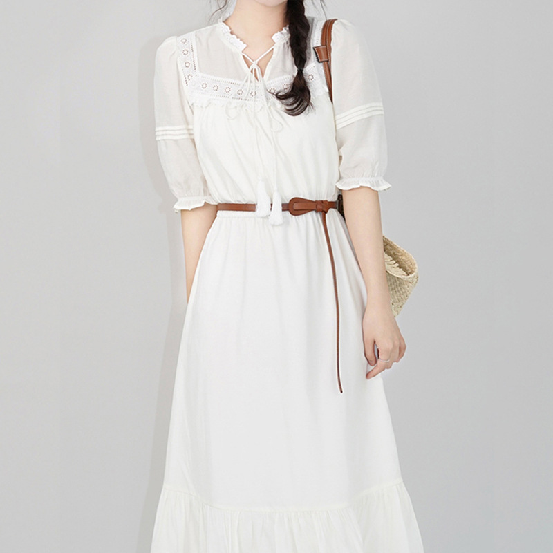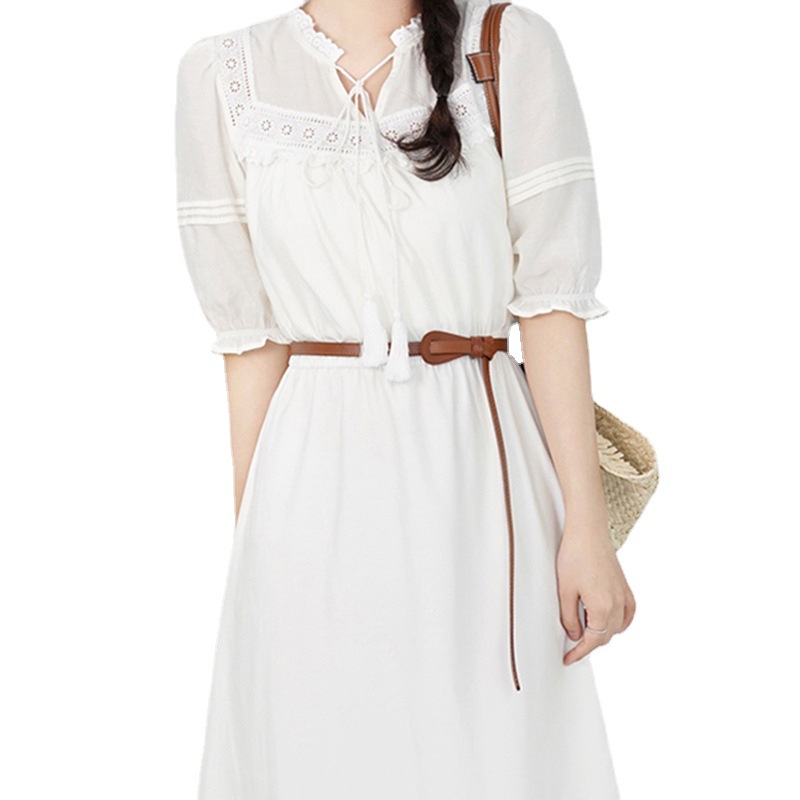 法式少女小v领系带白色温柔风仙女A字五分袖连衣裙女度假风长裙女