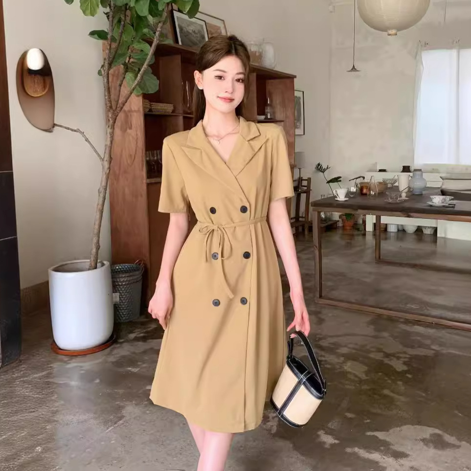 实拍现货~胖MM大码修身显瘦绑带裙中长款慵懒V领西装连衣裙女夏