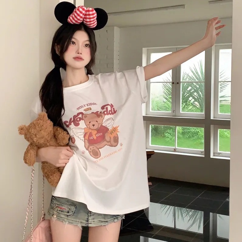 超手感莫代尔夏季新款韩版圆领宽松卡通印花短袖白色t恤上衣女
