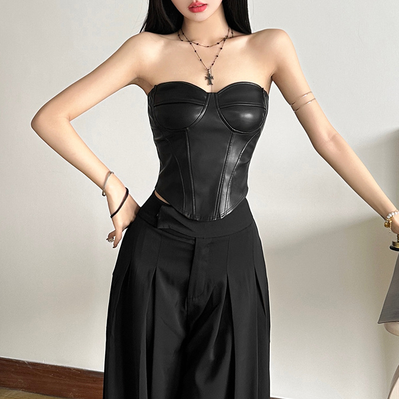 跨境欧美风新款女装无肩带无袖紧身设计黑色皮革小背心