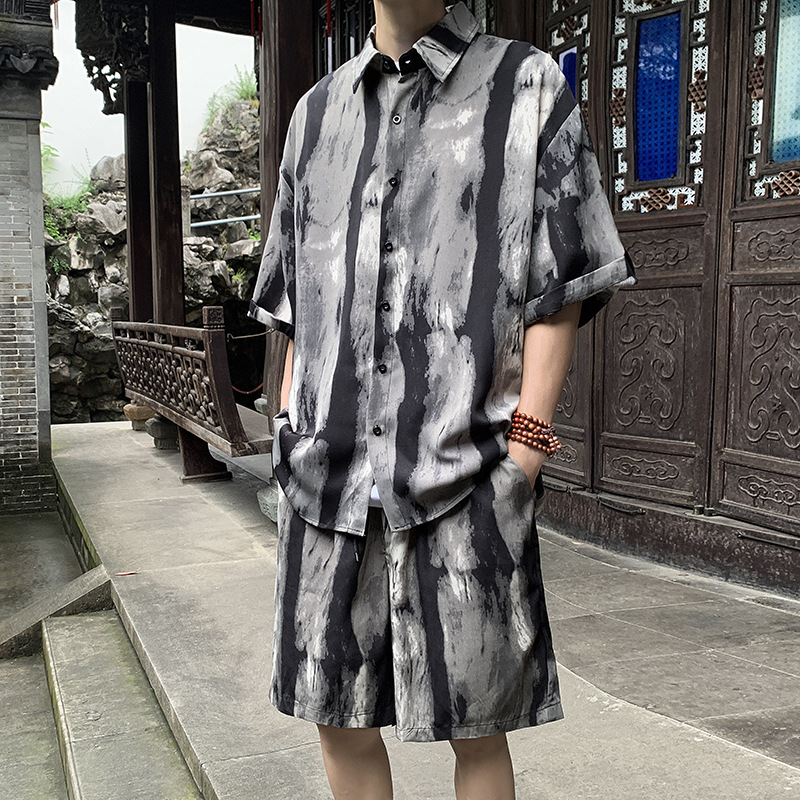 夏季海边度假复古花衬衫套装男水墨扎染两件套速干冰丝休闲沙滩裤