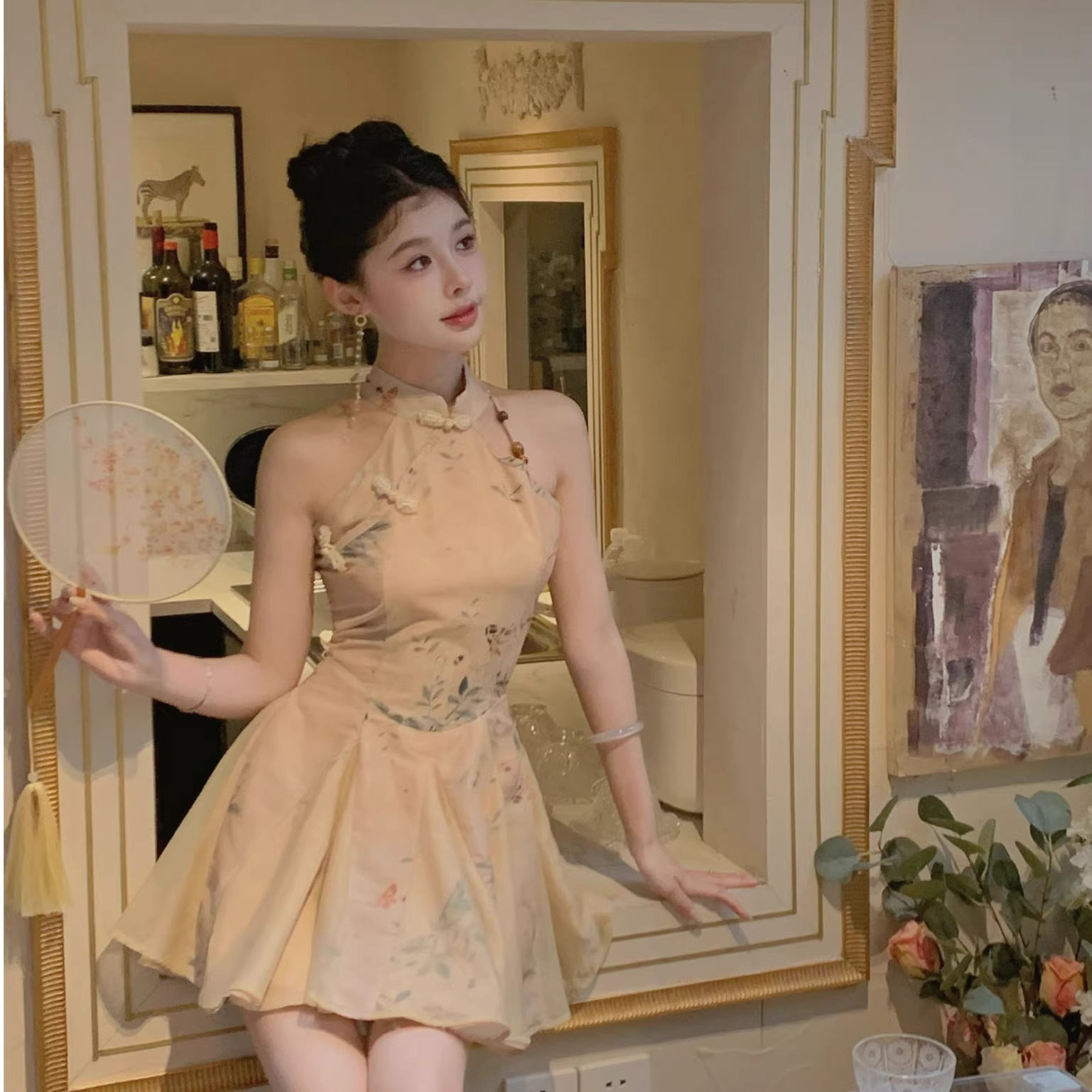 新中式国风挂脖连衣裙女夏季新款复古印花拼接收腰显瘦裙子