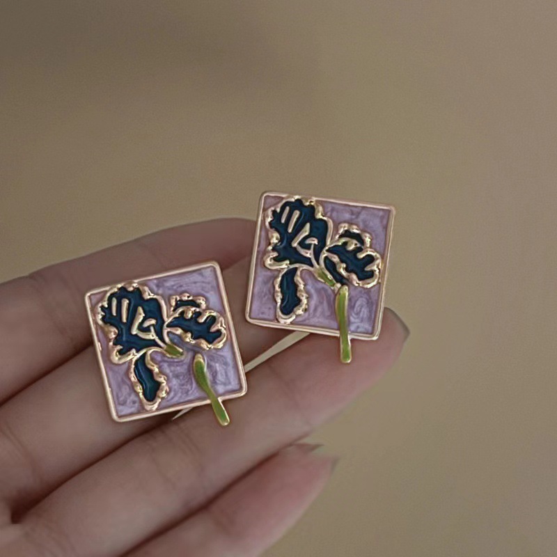 银针不规则滴油花朵耳钉方形清新甜美气质耳环复古百搭耳饰女