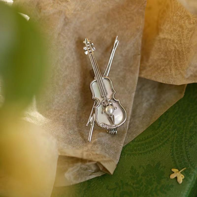 清弦古典艺术气质天然珍珠白蝶贝锆钻大提琴男女款胸针礼物