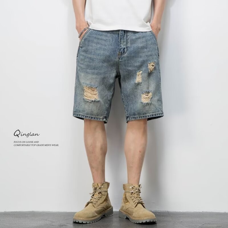 夏季破洞牛仔短裤男潮牌宽松休闲复古美式高街乞丐五分裤薄款中裤