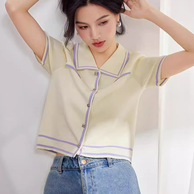 夏季新款杏色针织短袖衬衣女小个子修身撞色polo领气质上衣