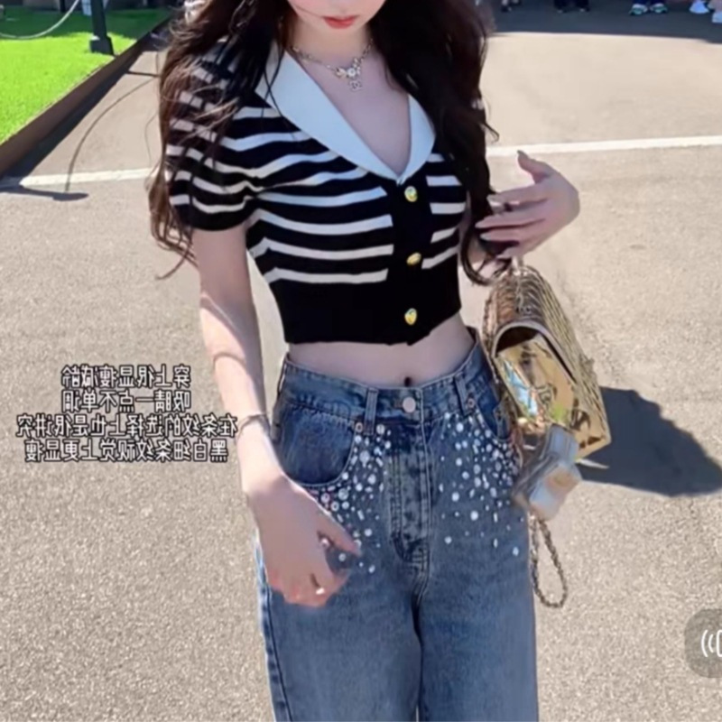 清纯校花 海军领短袖针织上衣条纹T恤女春夏新款