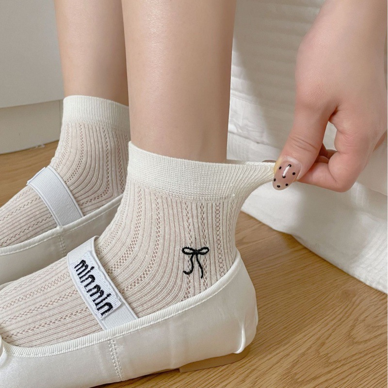 春夏季奶白色薄款JK袜子女短筒袜芭蕾风蝴蝶结甜美少女镂空袜子